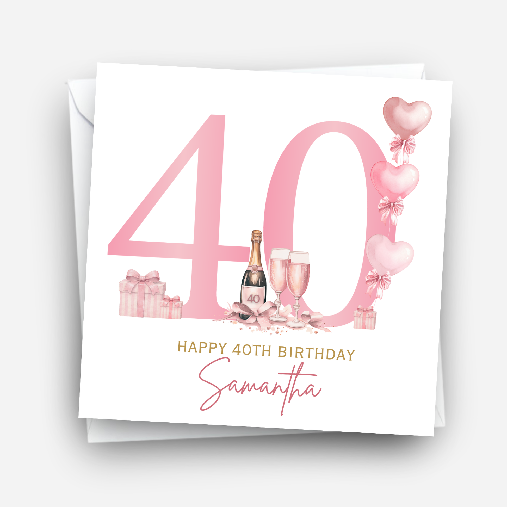 Featuring a stylish champagne bottle design with balloons and soft tones, it's perfect for birthdays of all ages – from 18ths to 80ths!