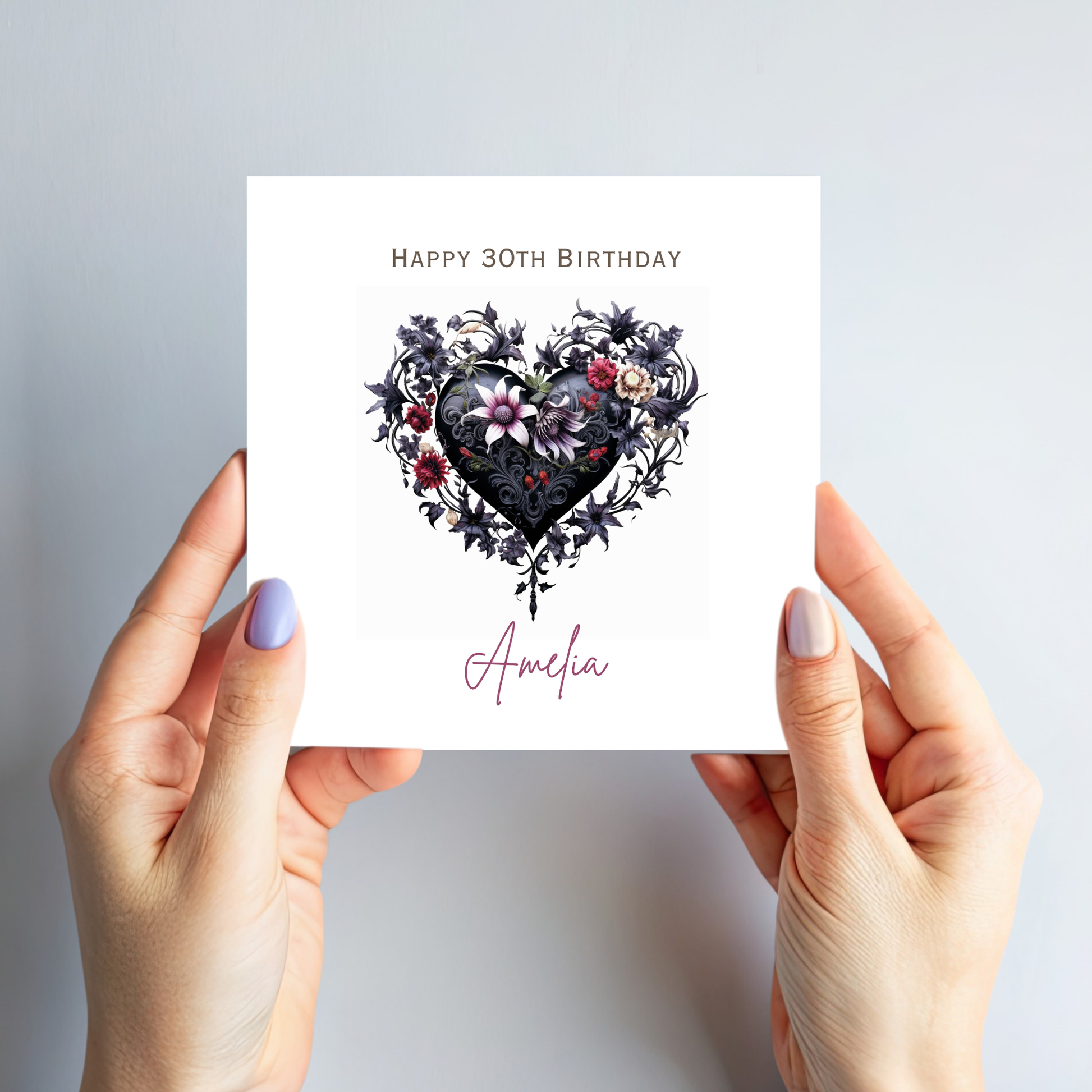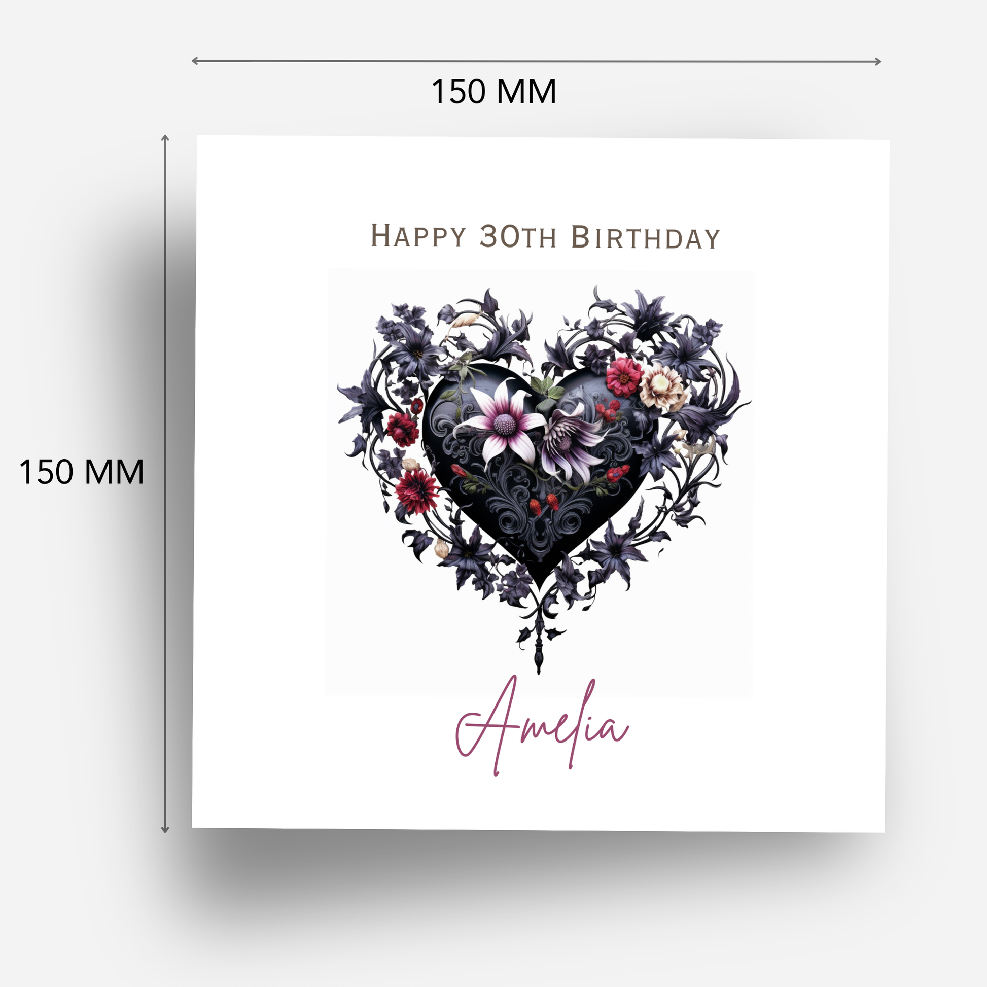 Make a bold statement with this gothic-style personalised birthday card, featuring a dramatic black and flower scrolled heart with elegant dark tones.