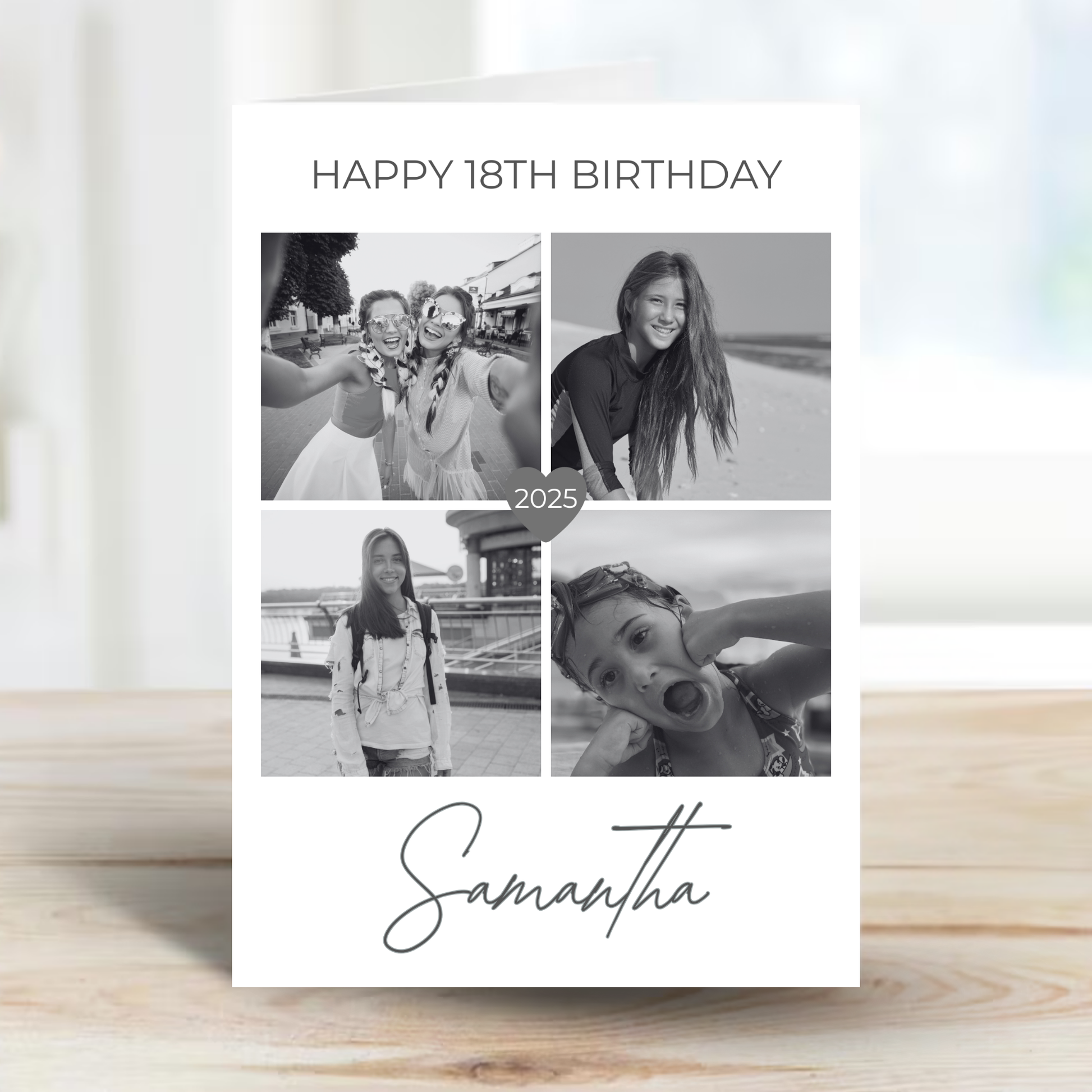Personalised birthday photo card with a 4 photos, name & any wording. A5 printed card with envelope, a unique keepsake for special birthdays.