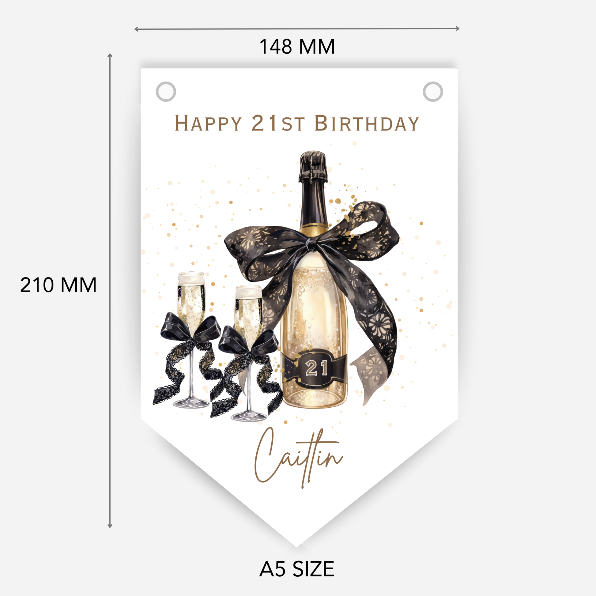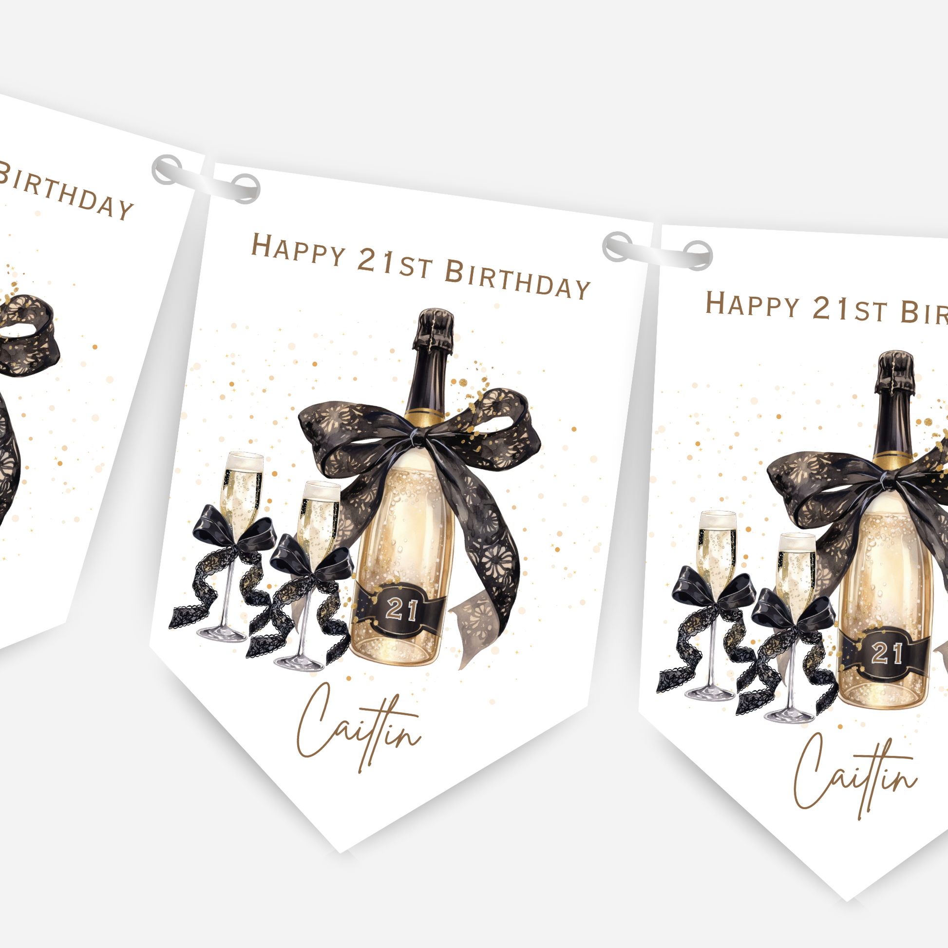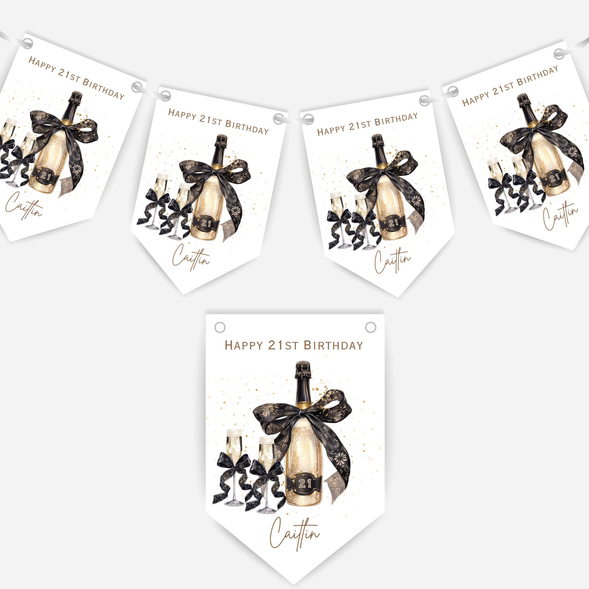 Featuring stylish black and gold champagne bottle illustrations and your custom name or message across the flags, this banner is perfect for birthdays, hen parties, or any champagne celebrations.
