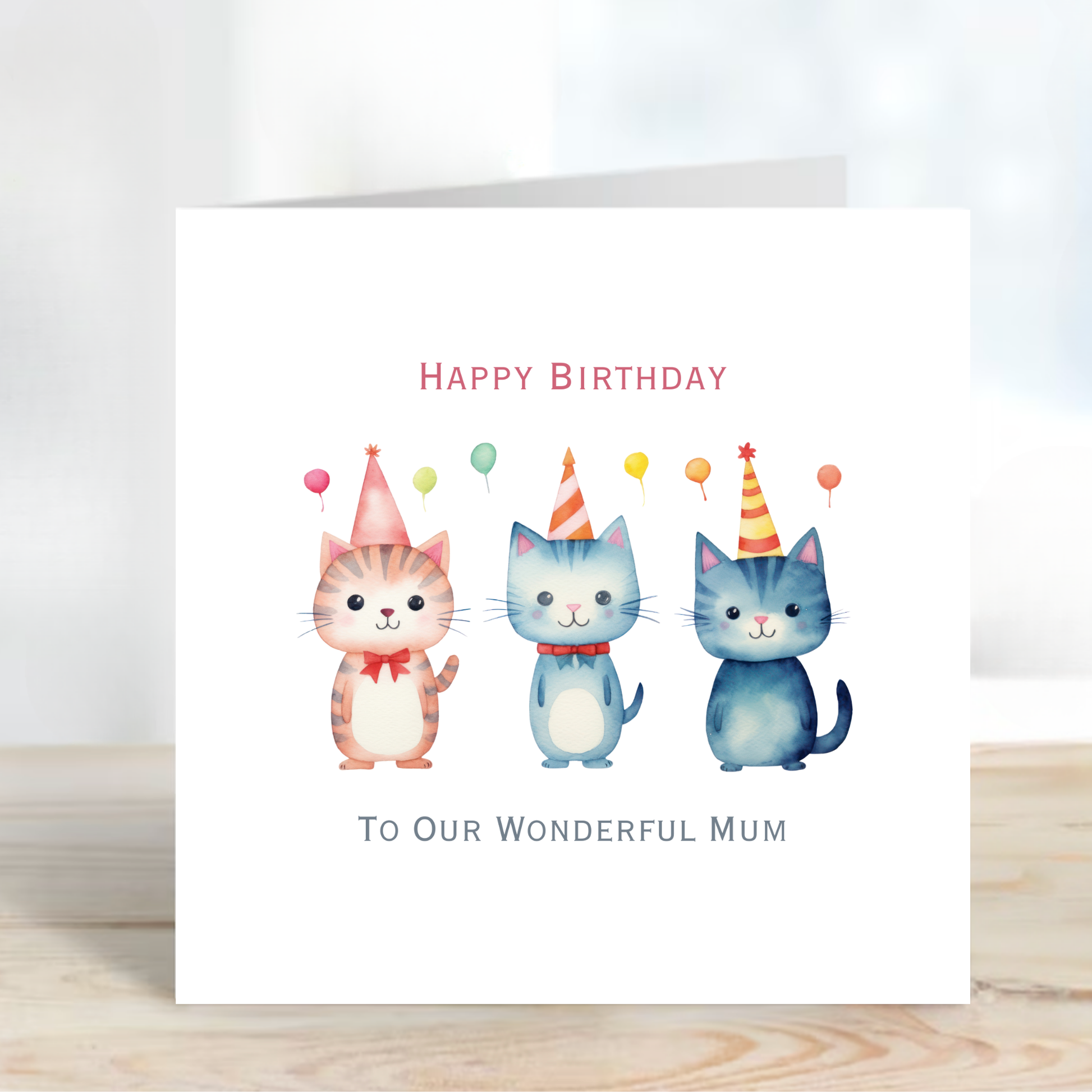 Personalised cat birthday card featuring cute kitty's in a party hats. Perfect for cat lovers and any age birthday celebration.