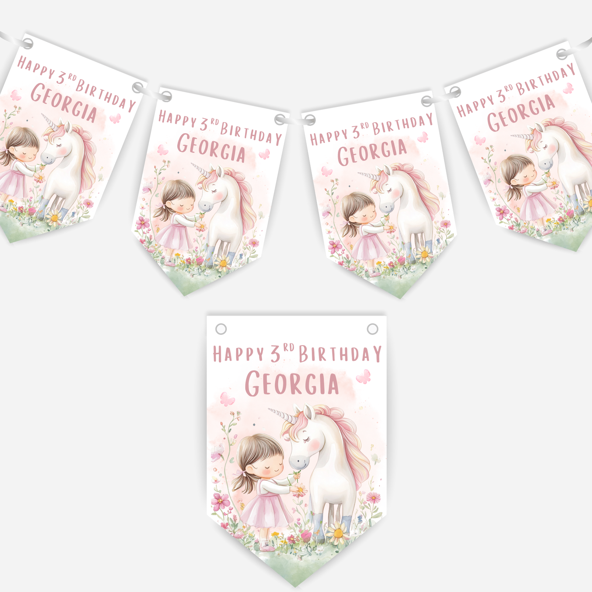Featuring an adorable unicorn and a little girl in a magical scene, this custom name banner is perfect for birthdays or any unicorn-themed event.