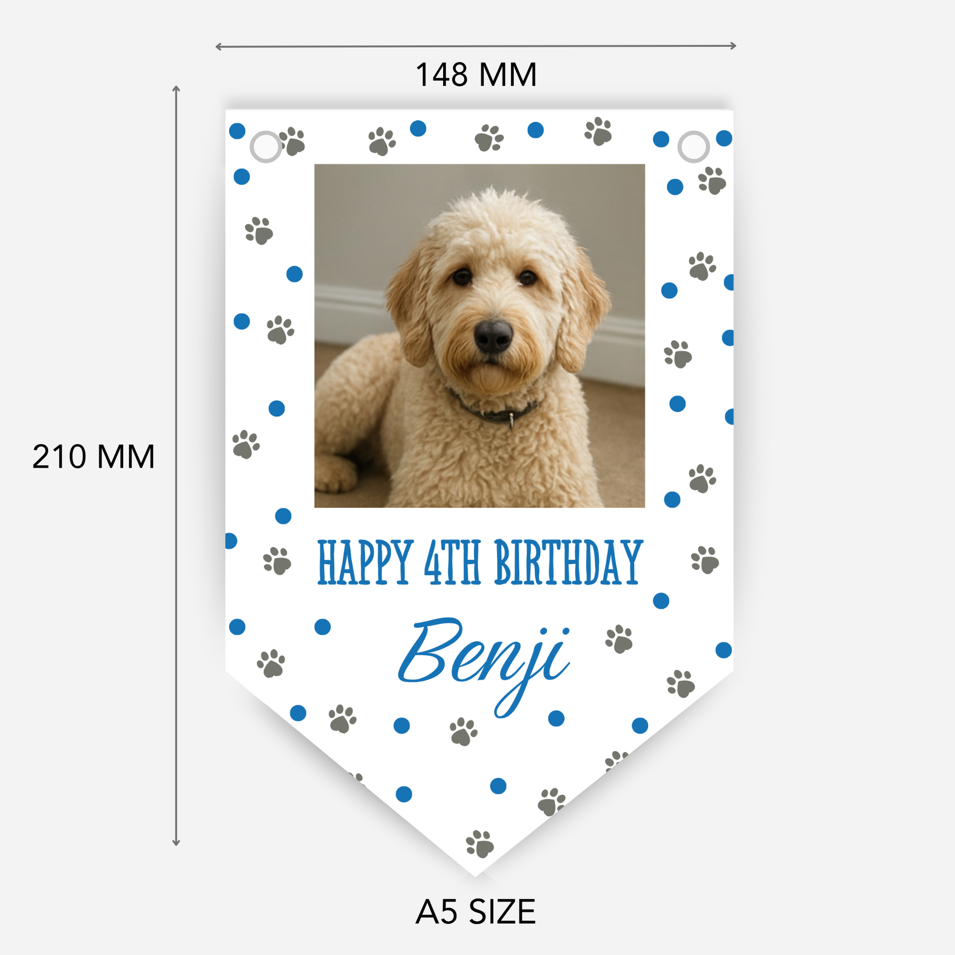 Make your dog’s big day paw-some with our personalised dog birthday bunting. This custom party banner is beautifully printed with your dog’s name, age, and up to 8 of your favourite photos, making it a unique and heartwarming decoration.