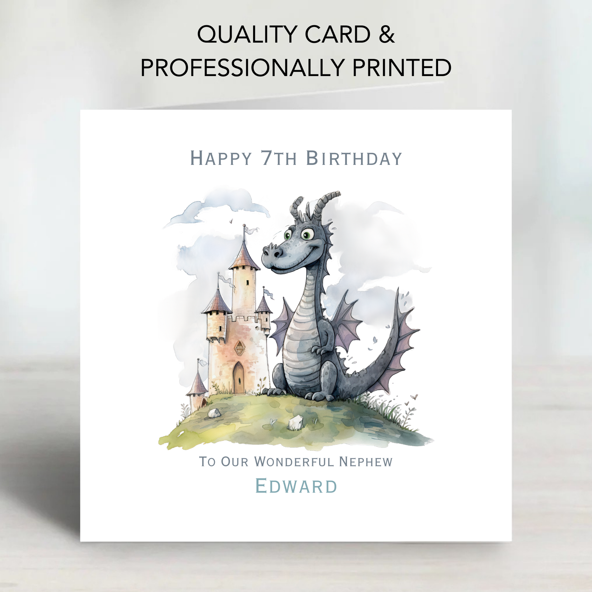 Each card is custom printed with any name and wording, creating a thoughtful keepsake that’s truly unique. Whether it’s for a child, friend, or family member, this dragon and castle card brings a playful, storybook feel to any birthday celebration.