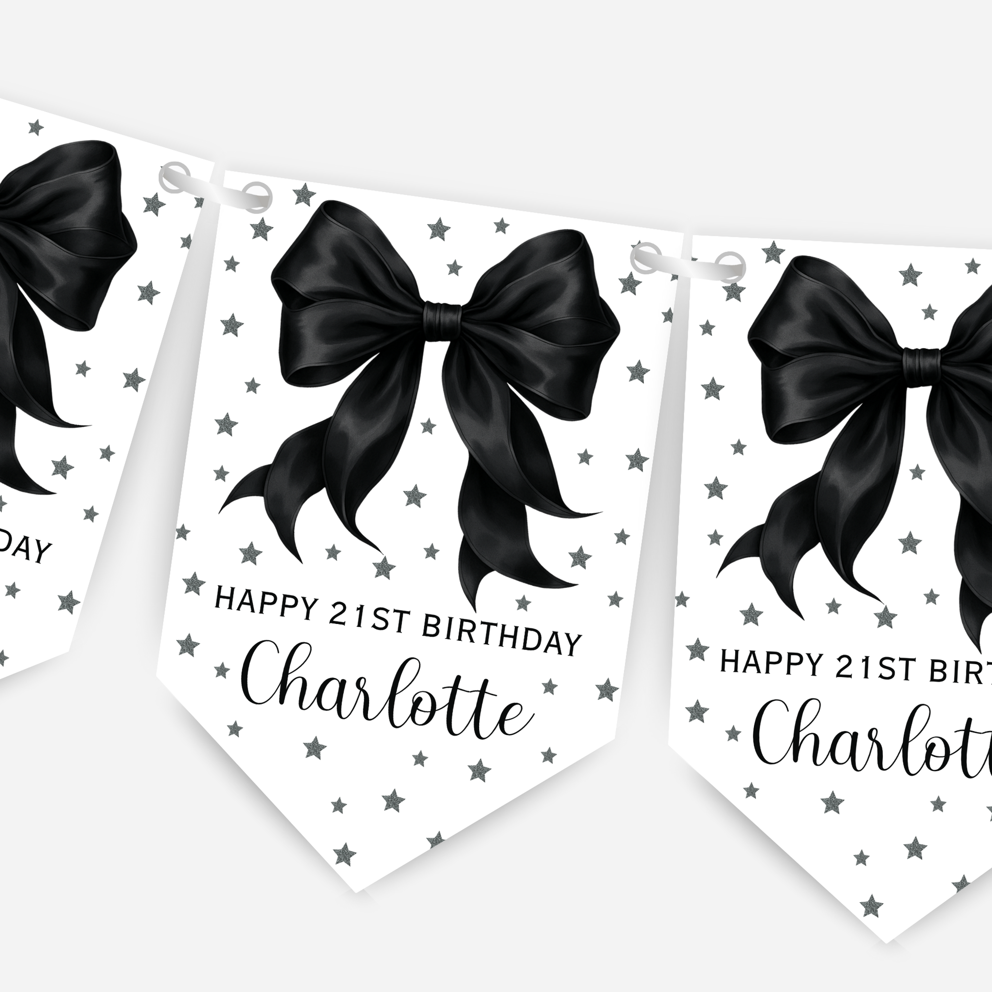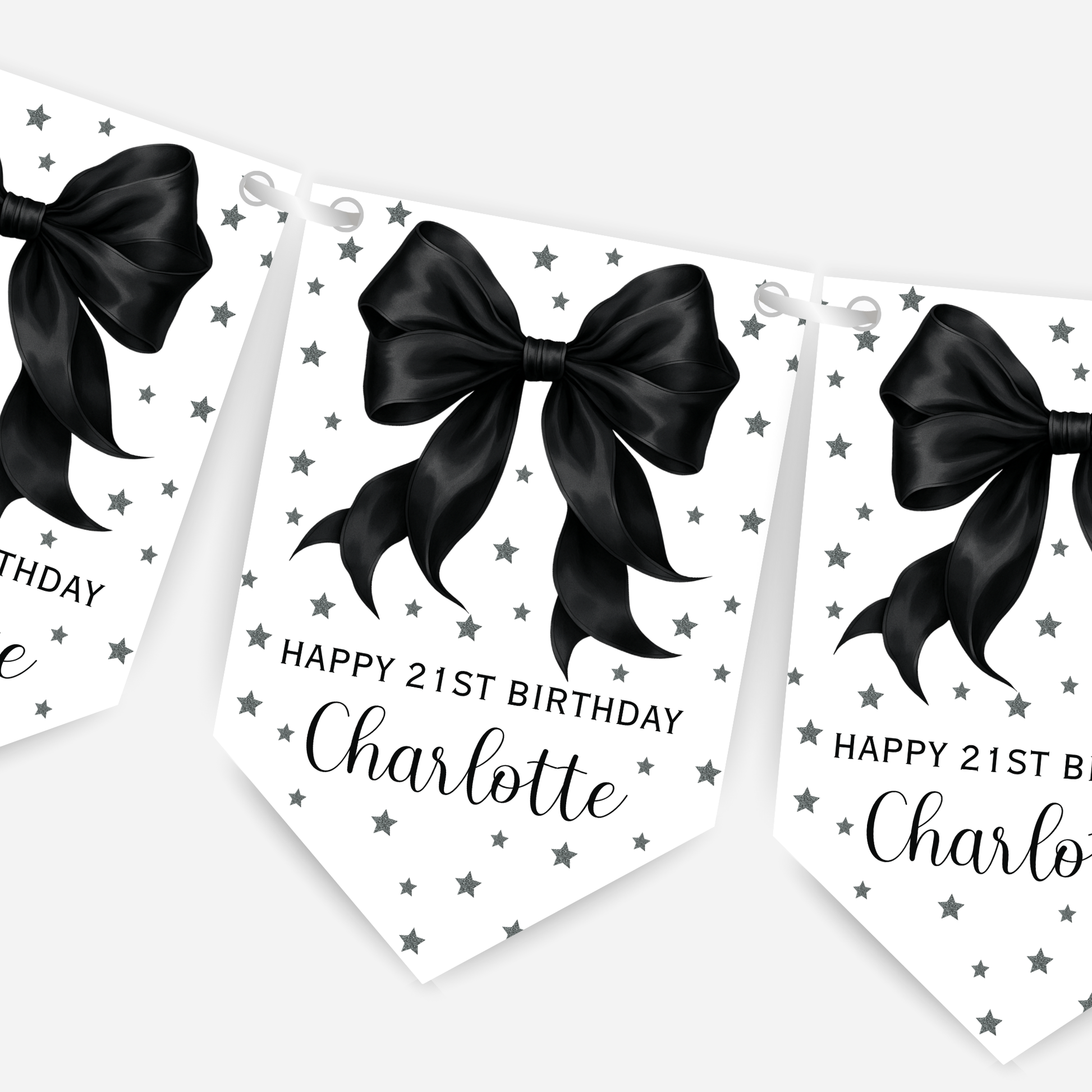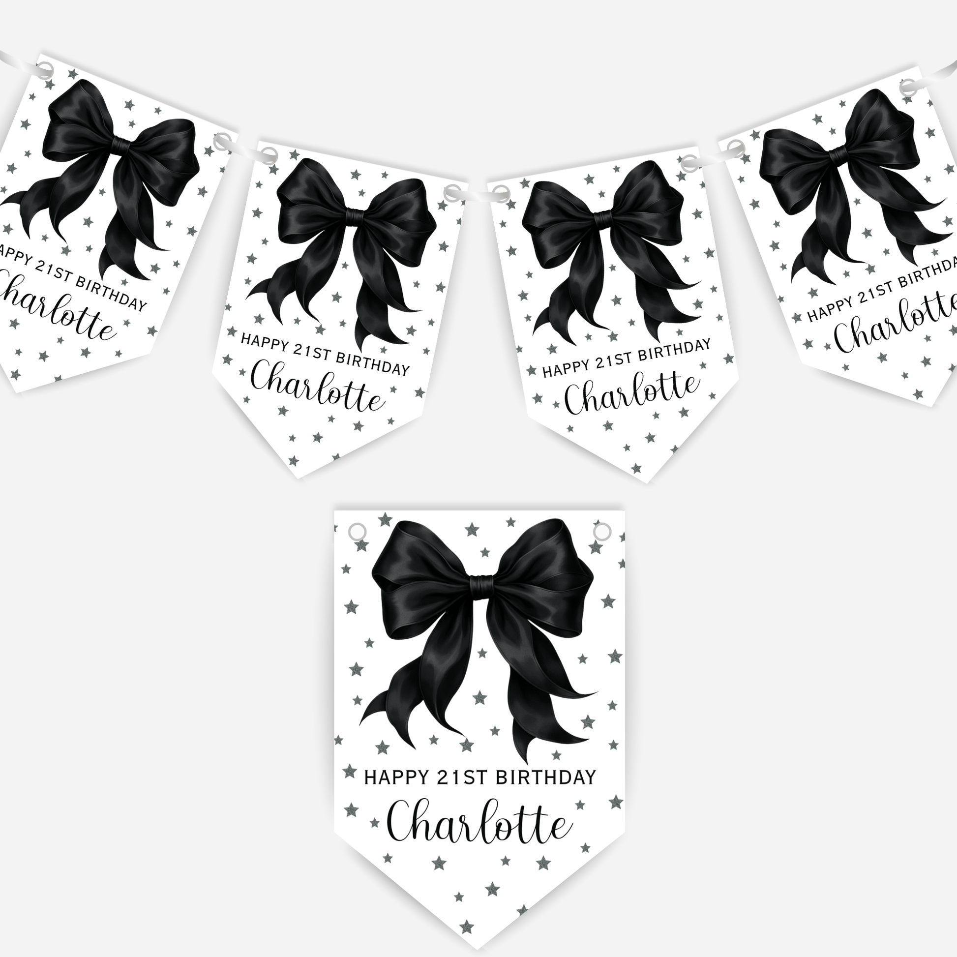 Add a stylish touch to your celebration with this printed and personalised bunting, designed in a elegant black bow style to suit any age.