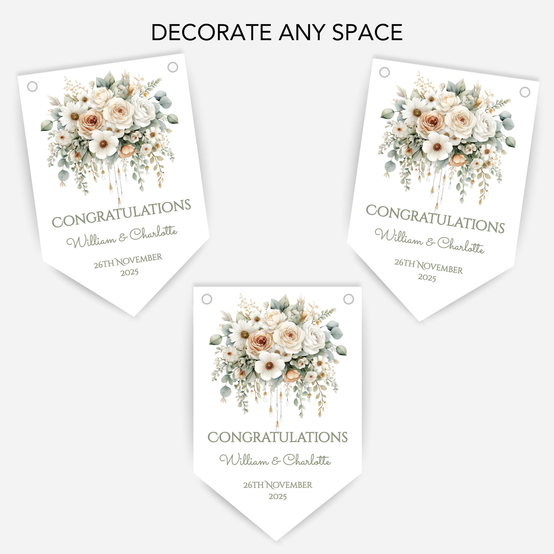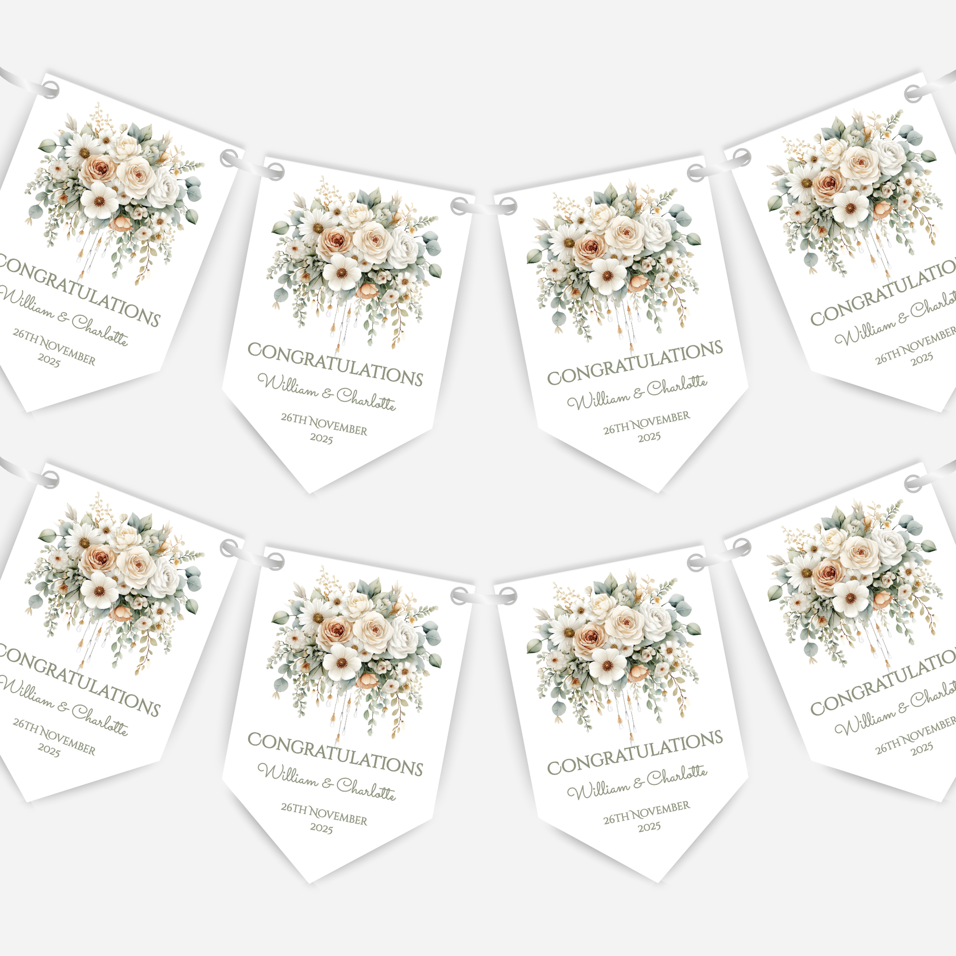 Celebrate the newly engaged or recently married couple with this printed and personalised engagement bunting featuring a beautiful natural floral design.