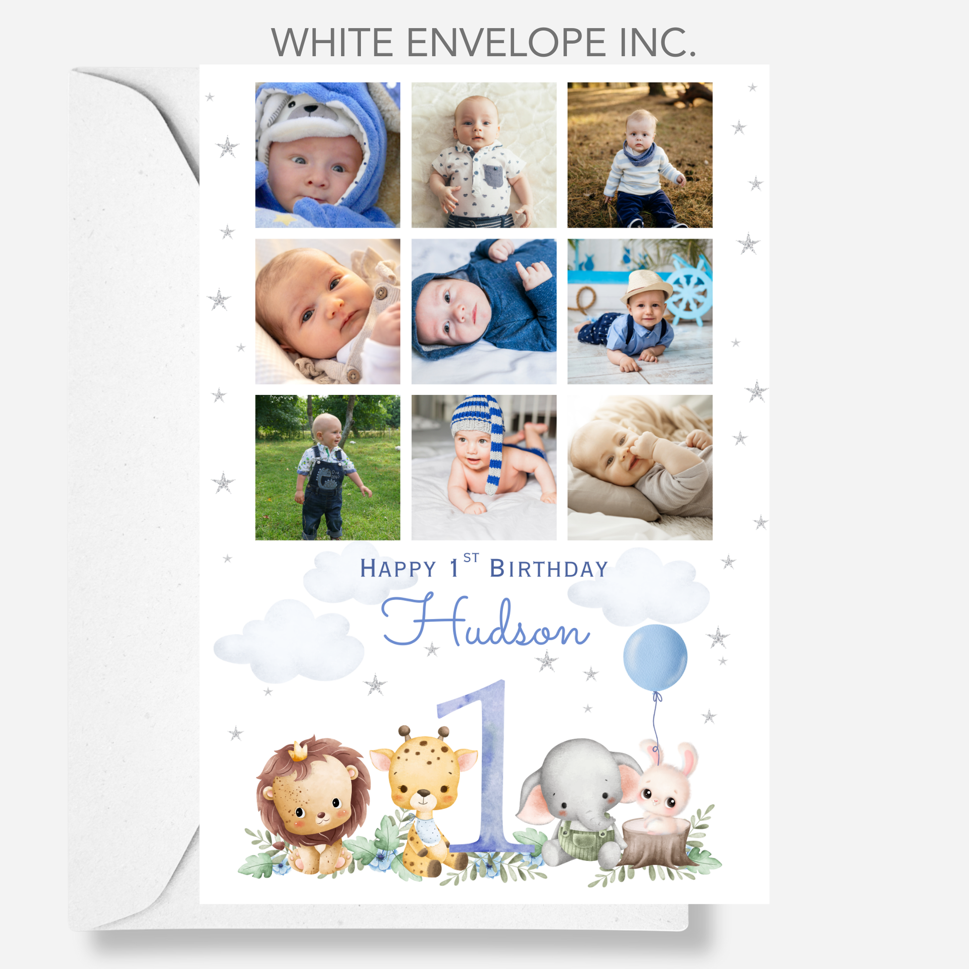 Celebrate their special birthday with a personalised photo card featuring 9 photos of your choice and a cute baby animal scene.