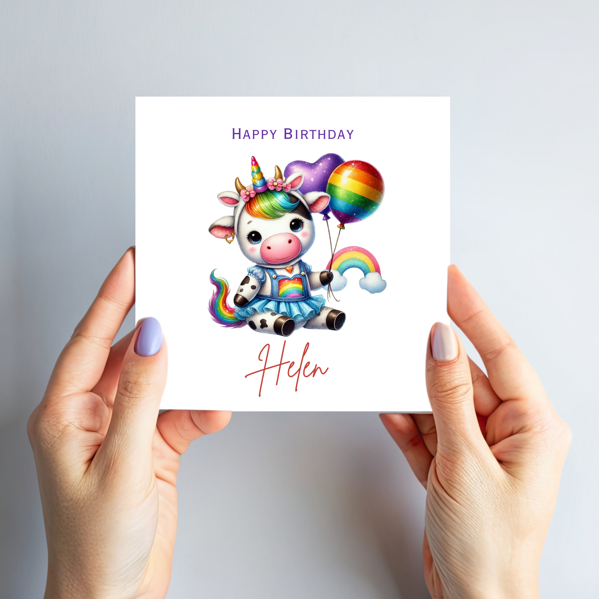 Bring a burst of fun to their celebration with this personalised fun cow birthday card, featuring a quirky cartoon cow dressed as a unicorn holding colourful balloons and a rainbow!