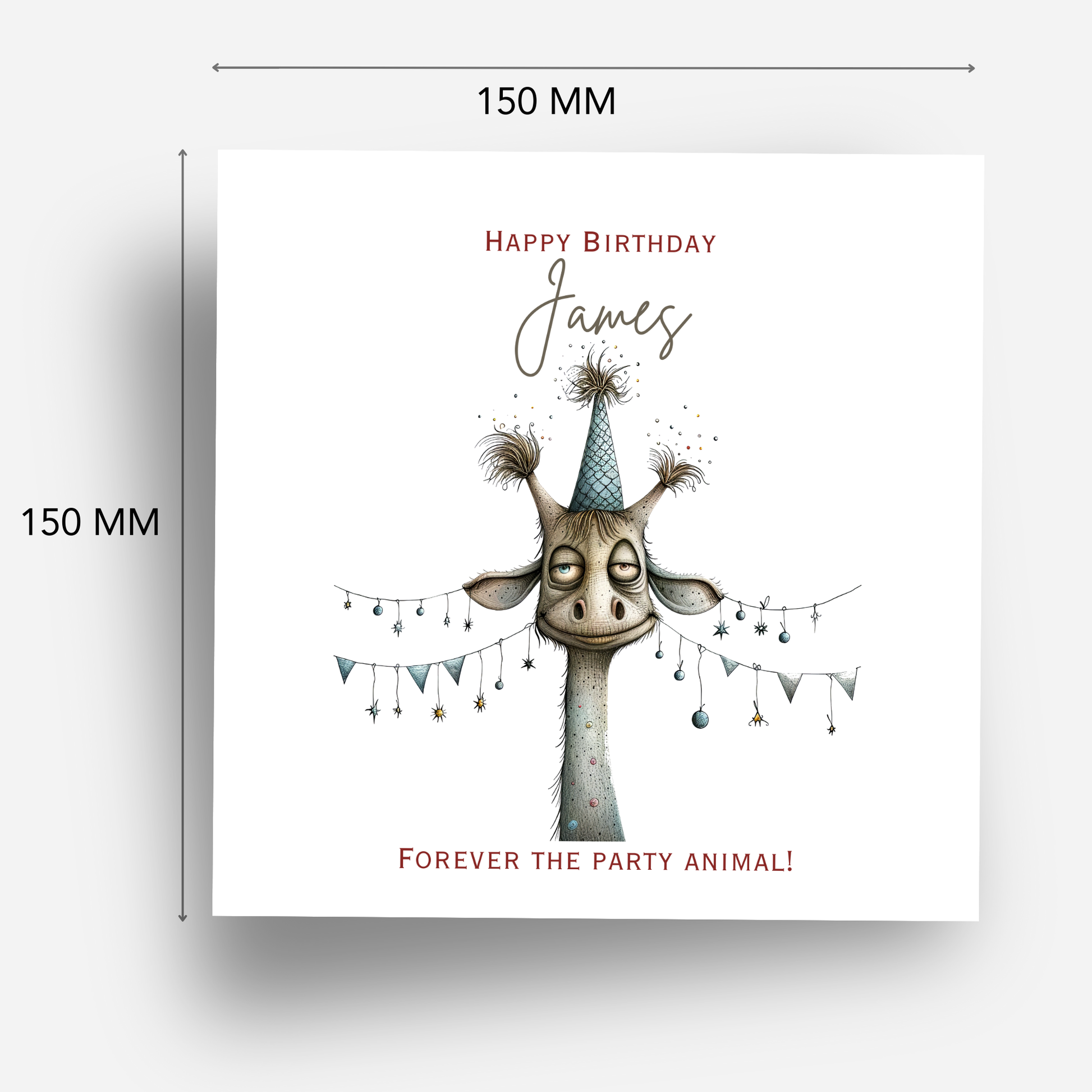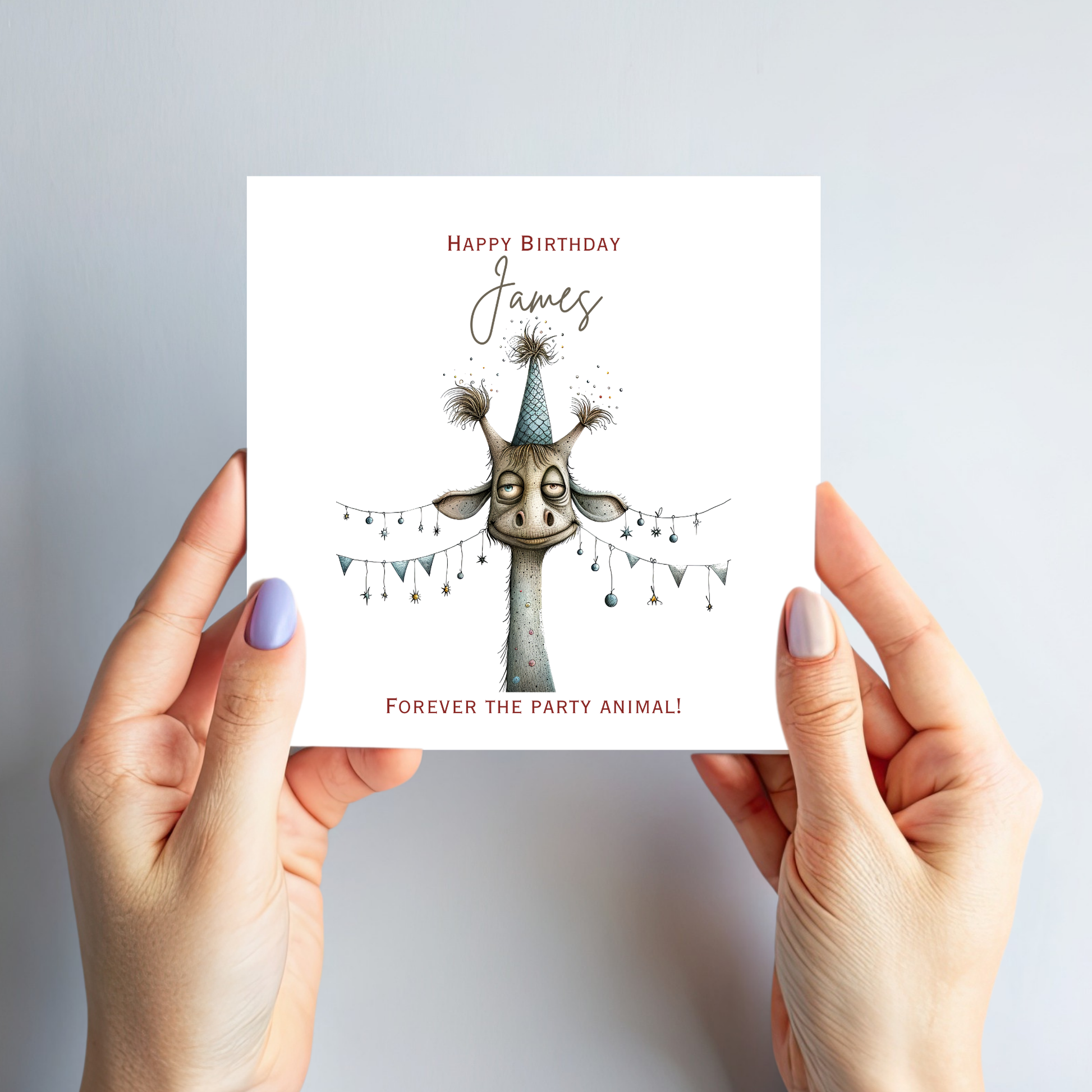 Make them smile with this adorable personalised giraffe birthday card, featuring a charming hand-drawn giraffe in a party hat. Perfect for any age or relation, from children to adults, this playful design adds fun and warmth to any celebration.