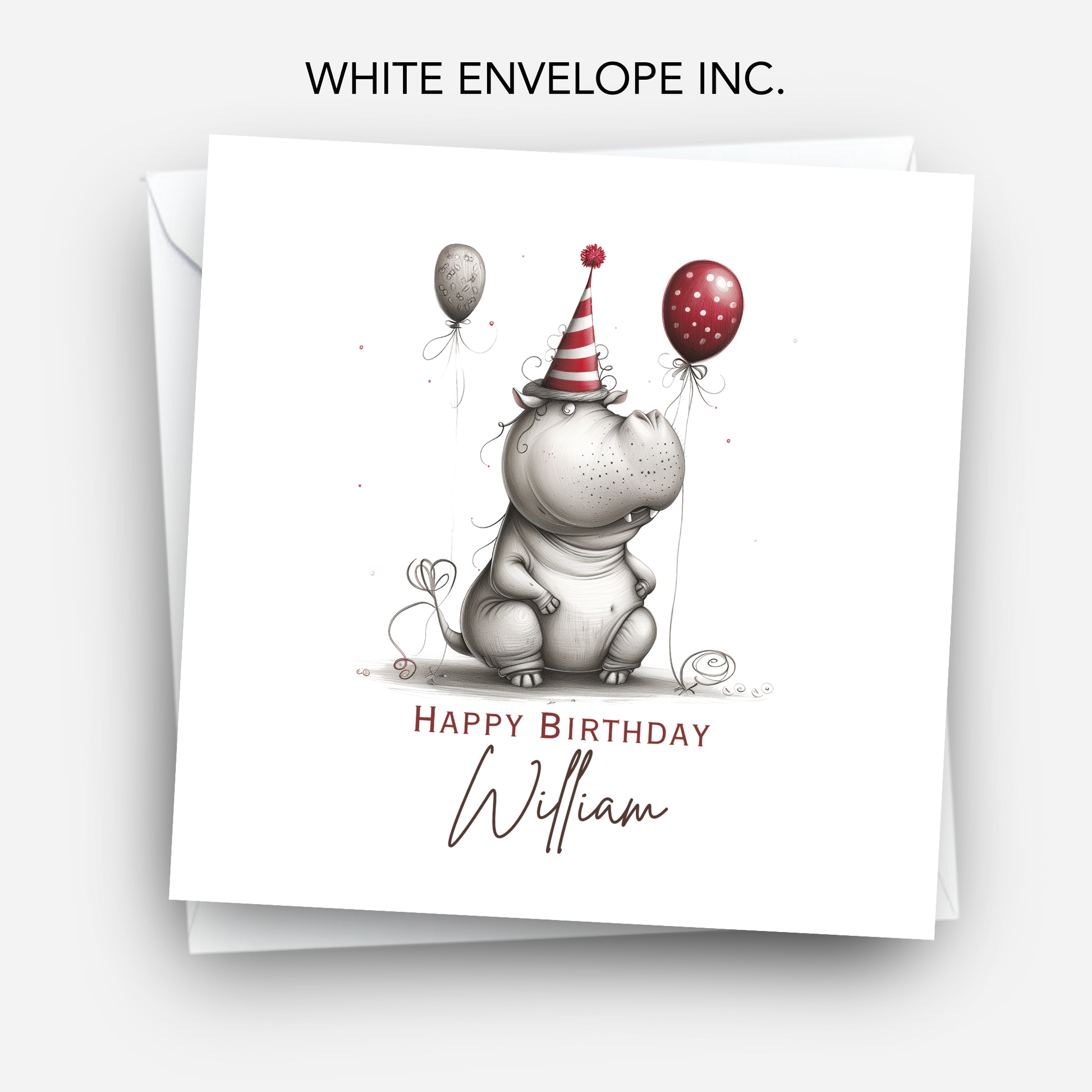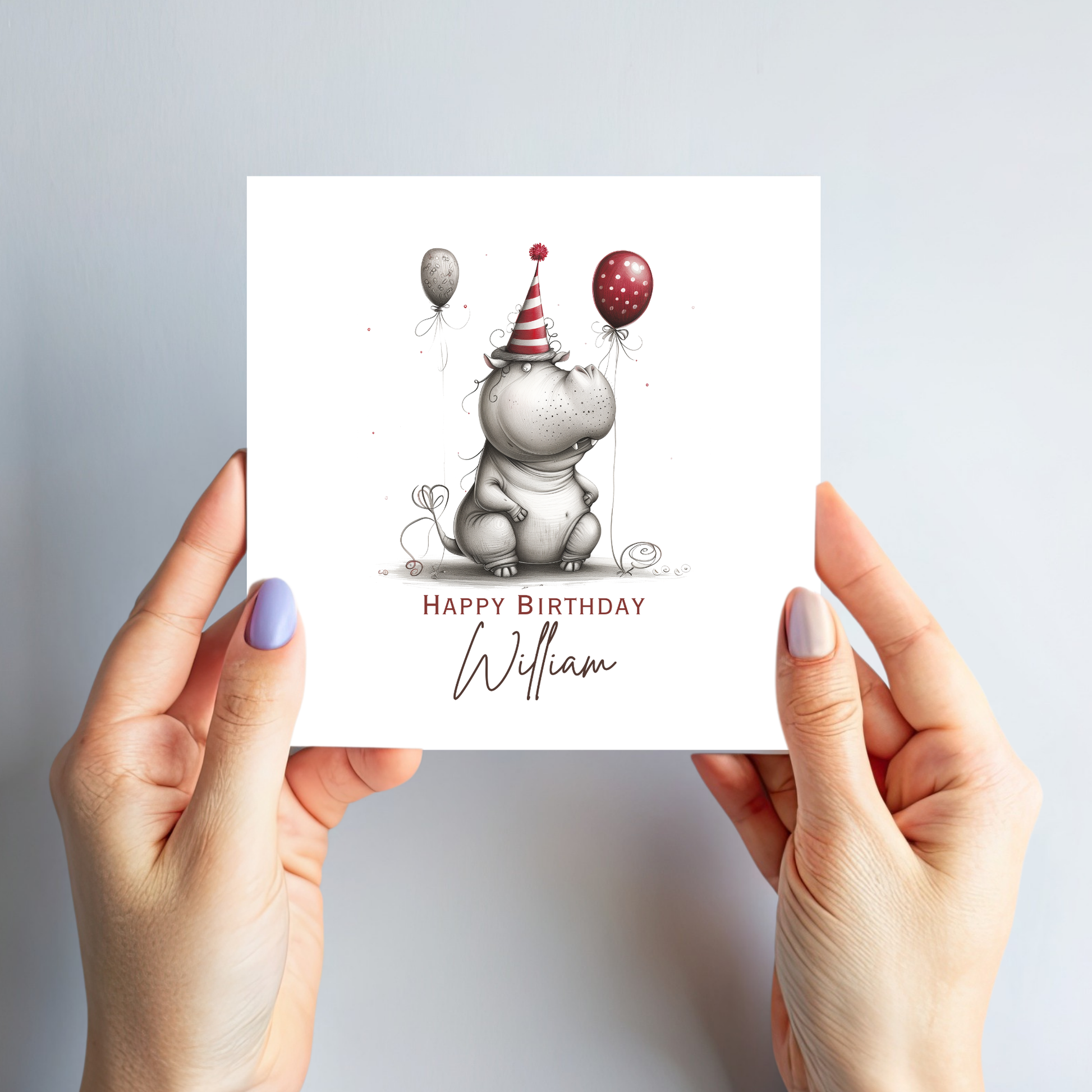 Adorable personalised hippo birthday card featuring a cute hippo in a party hat with balloons – perfect for any age, relation or celebration!