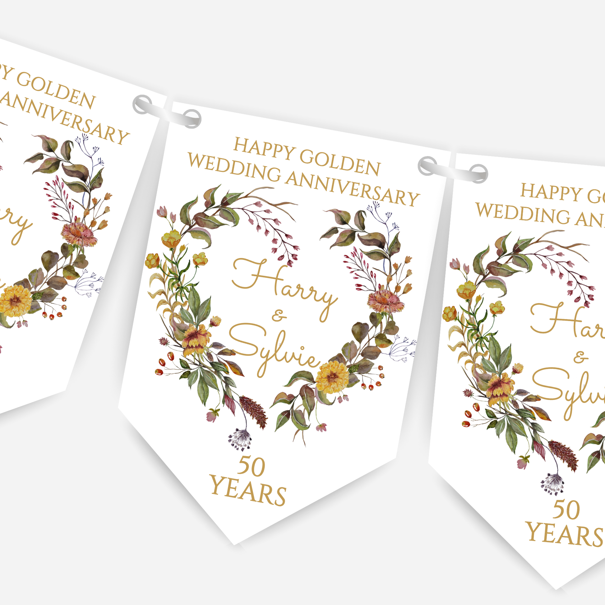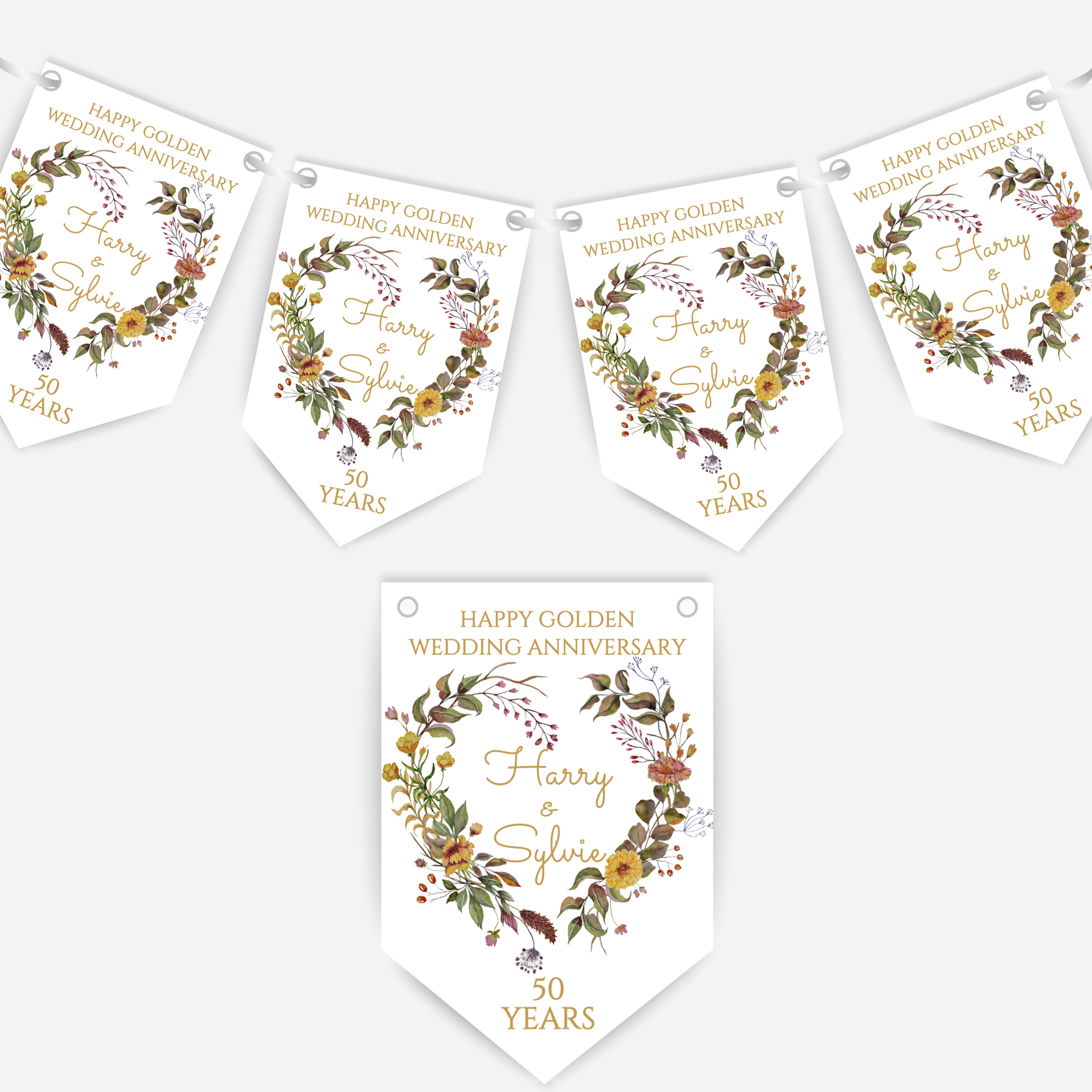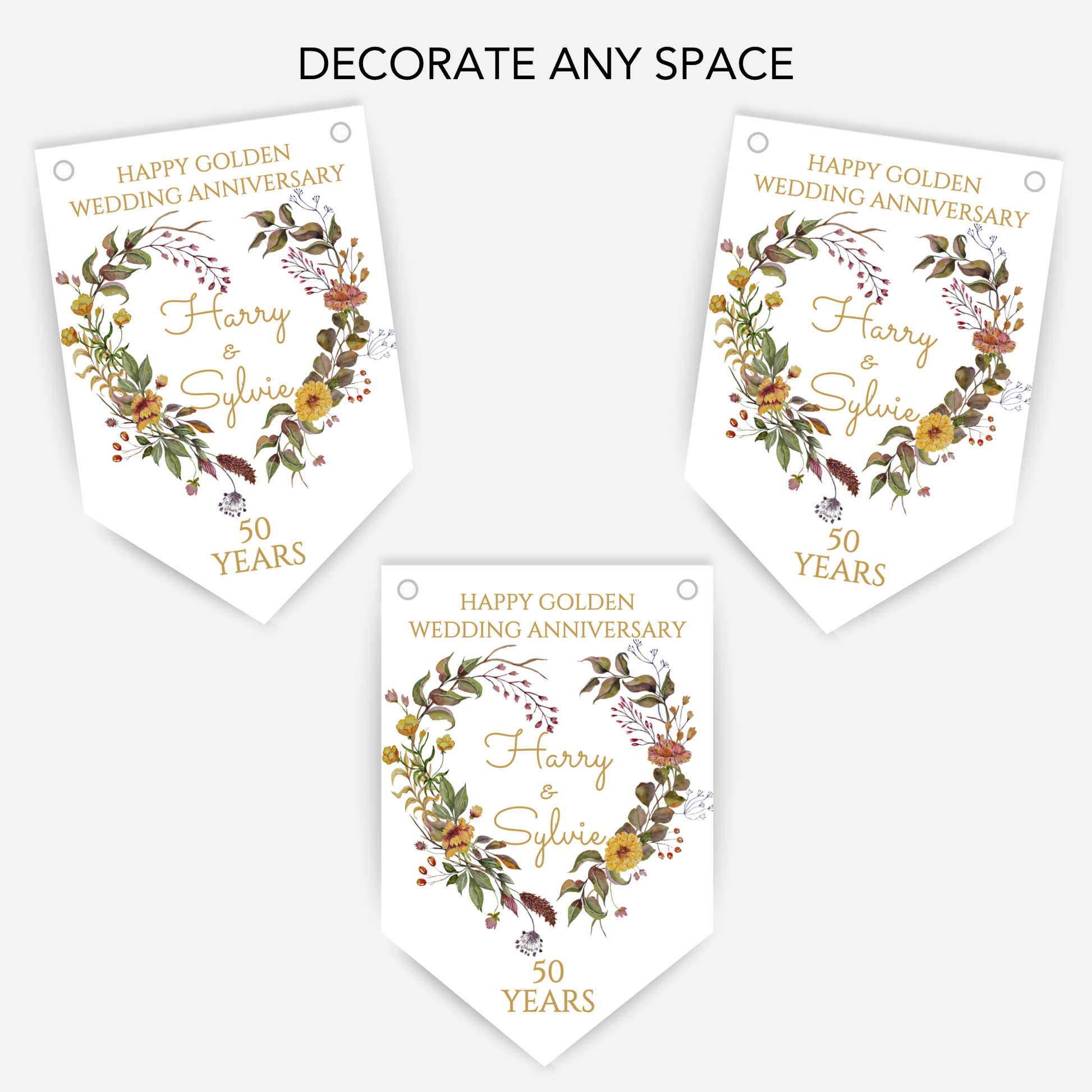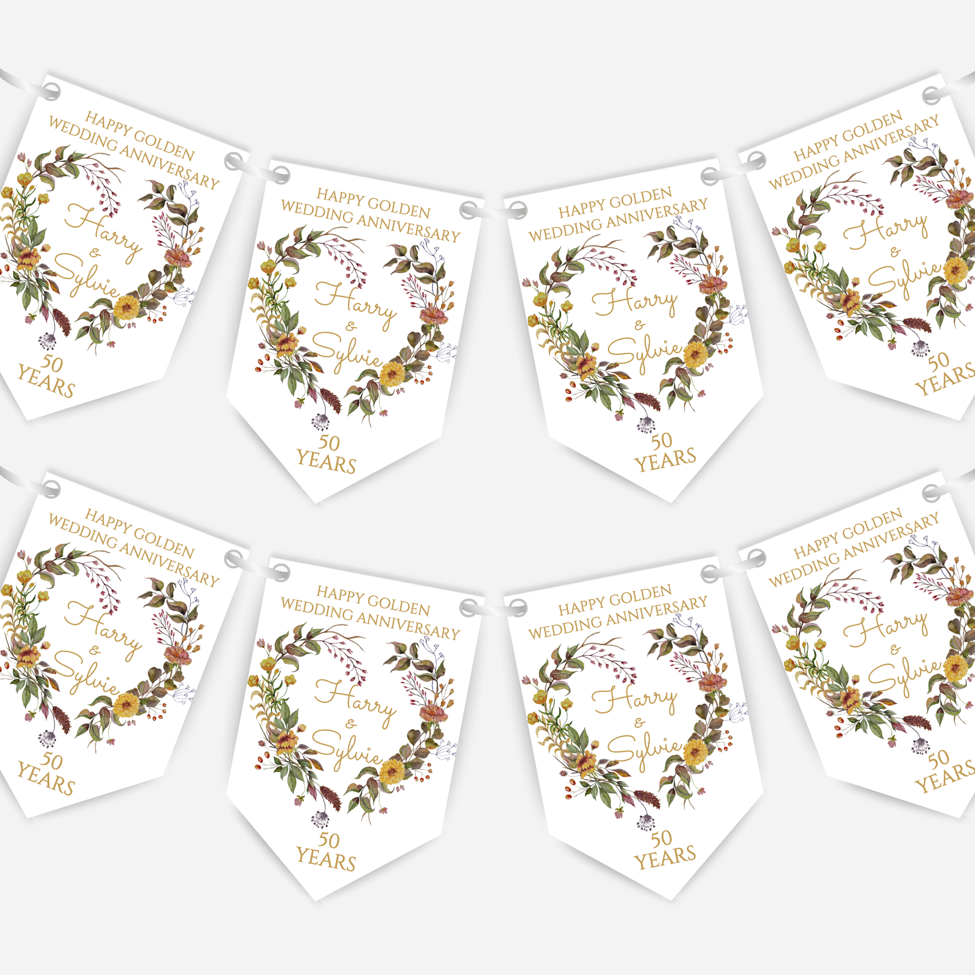 Celebrate a golden milestone with this printed and personalised Golden Wedding bunting, perfect for a 50th wedding anniversary. Featuring elegant rustic tones and your custom names added to this high-quality bunting.