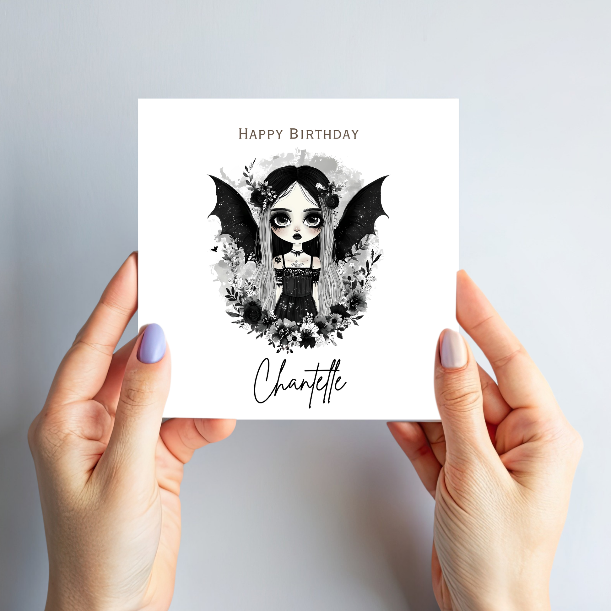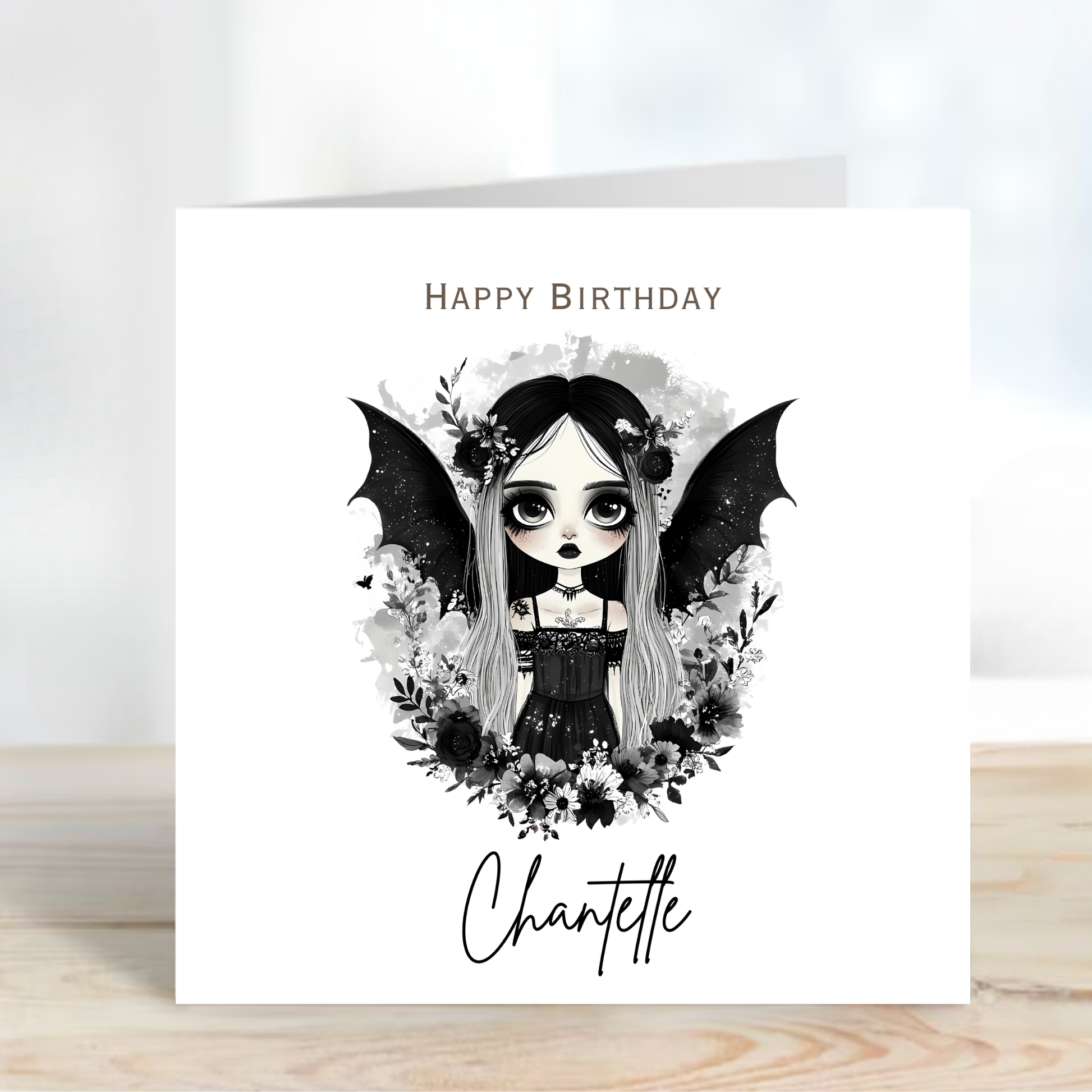 Celebrate a special day with this personalised gothic birthday card, featuring a whimsical dark fantasy girl illustration.