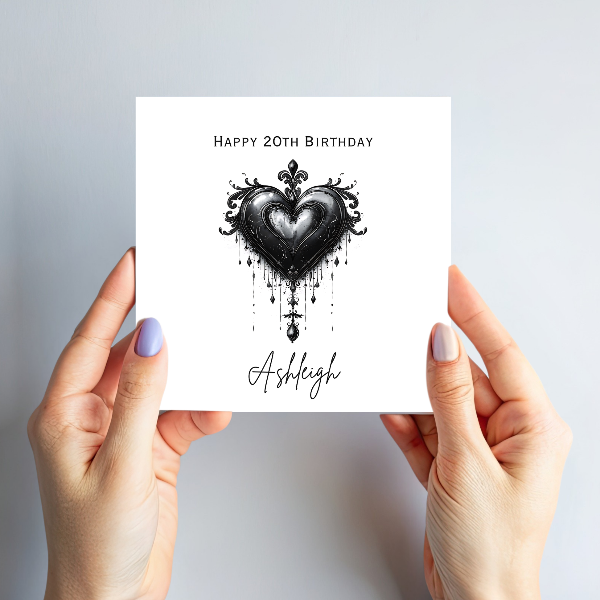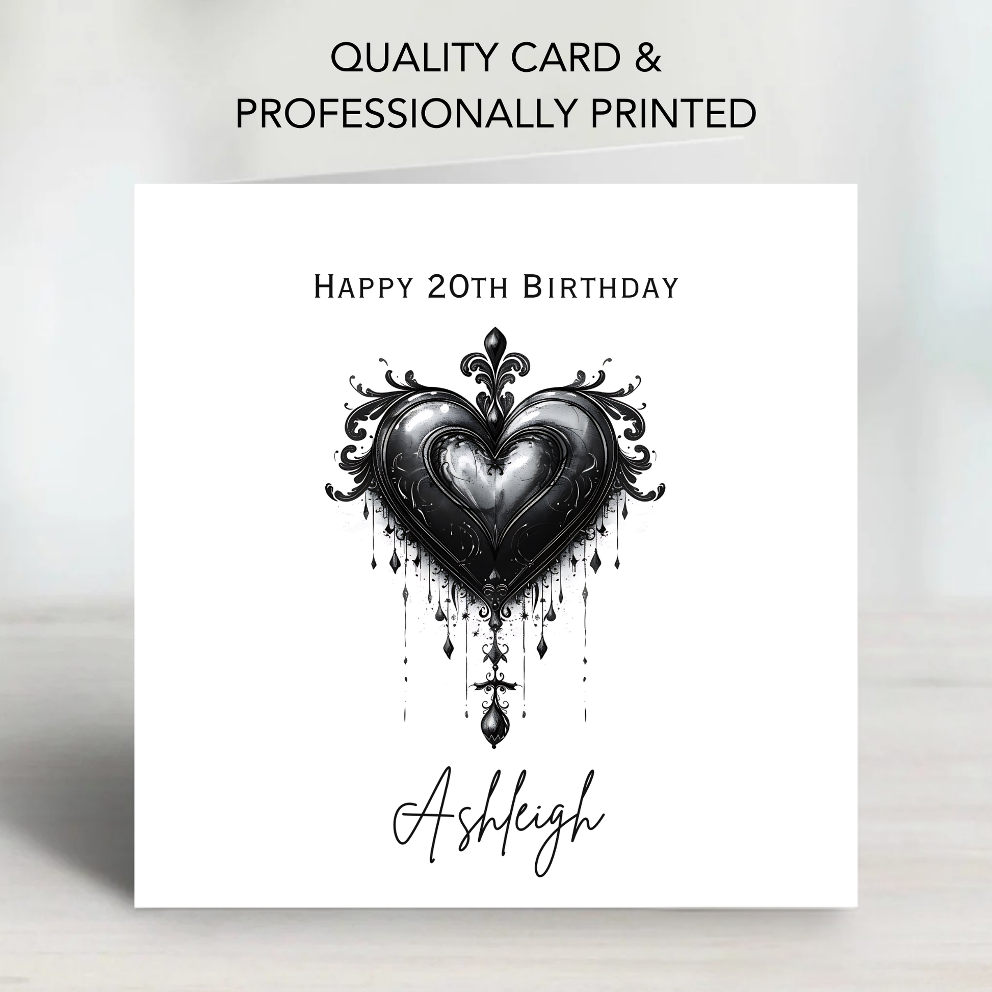 Make a bold statement with this gothic-style personalised birthday card, featuring a dramatic black and flower scrolled heart with elegant dark tones.