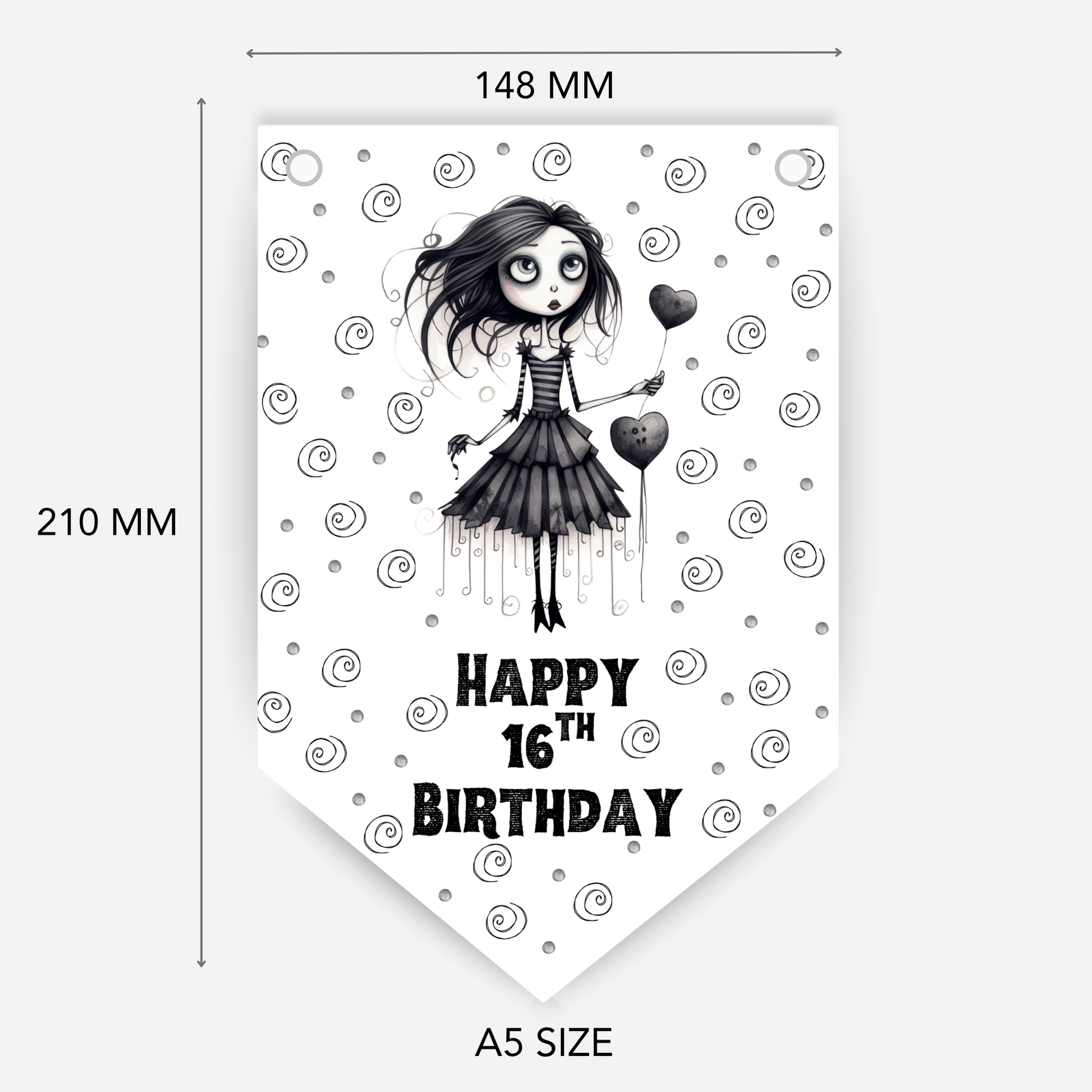 Celebrate in alternative style with this gothic birthday bunting, personalised with the name and age of your choice and featuring a featuring a whimsical dark fantasy girl illustration with heart-shaped balloons.