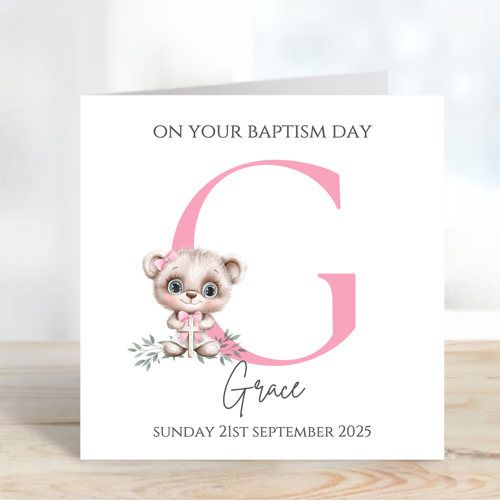 A beautifully printed Christening or Baptism card featuring a Teddy and Initial design, personalised with the child's name and the date of their special day.