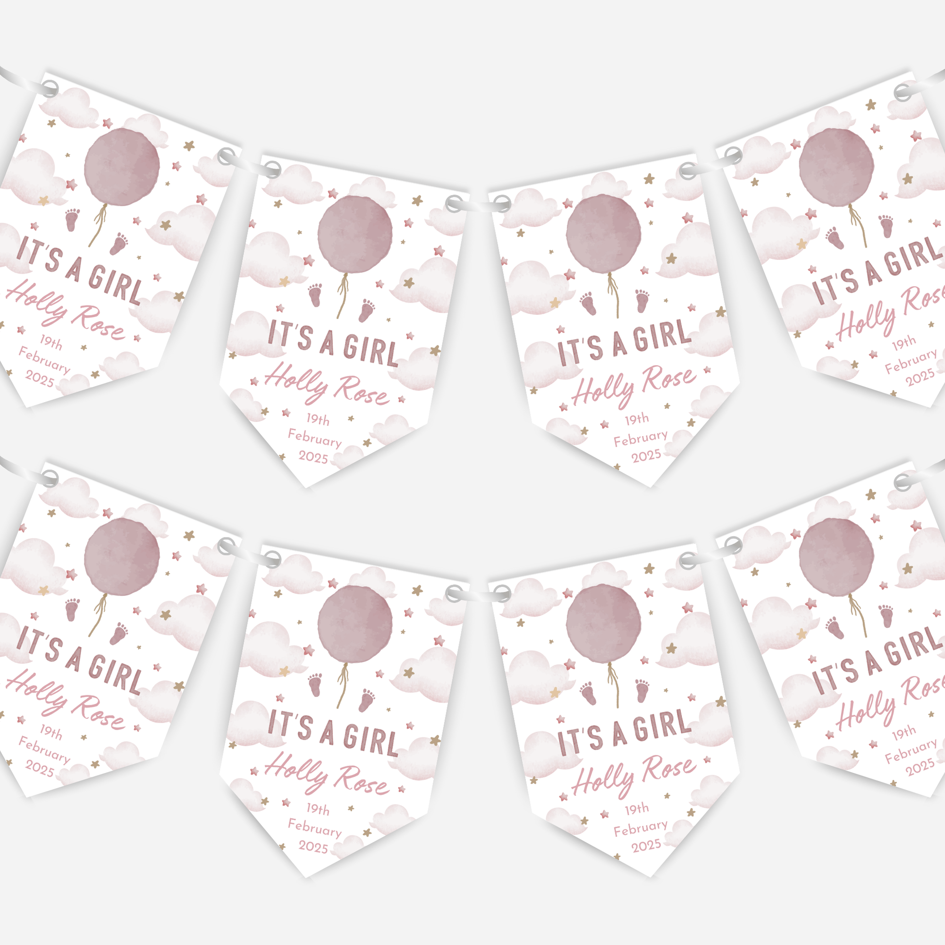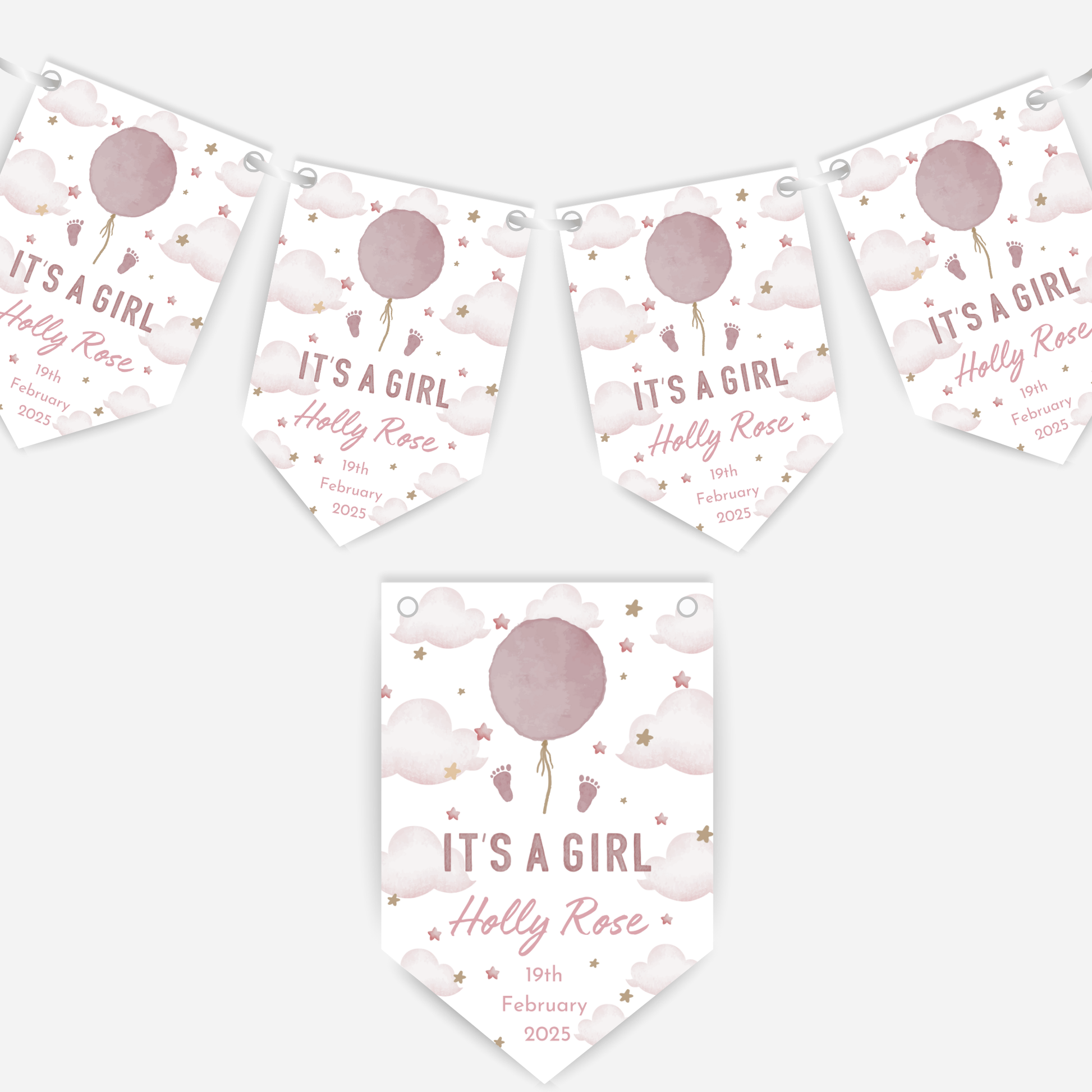 Celebrate the arrival of your little one with this printed and personalised "Itโs a Girl" bunting.
