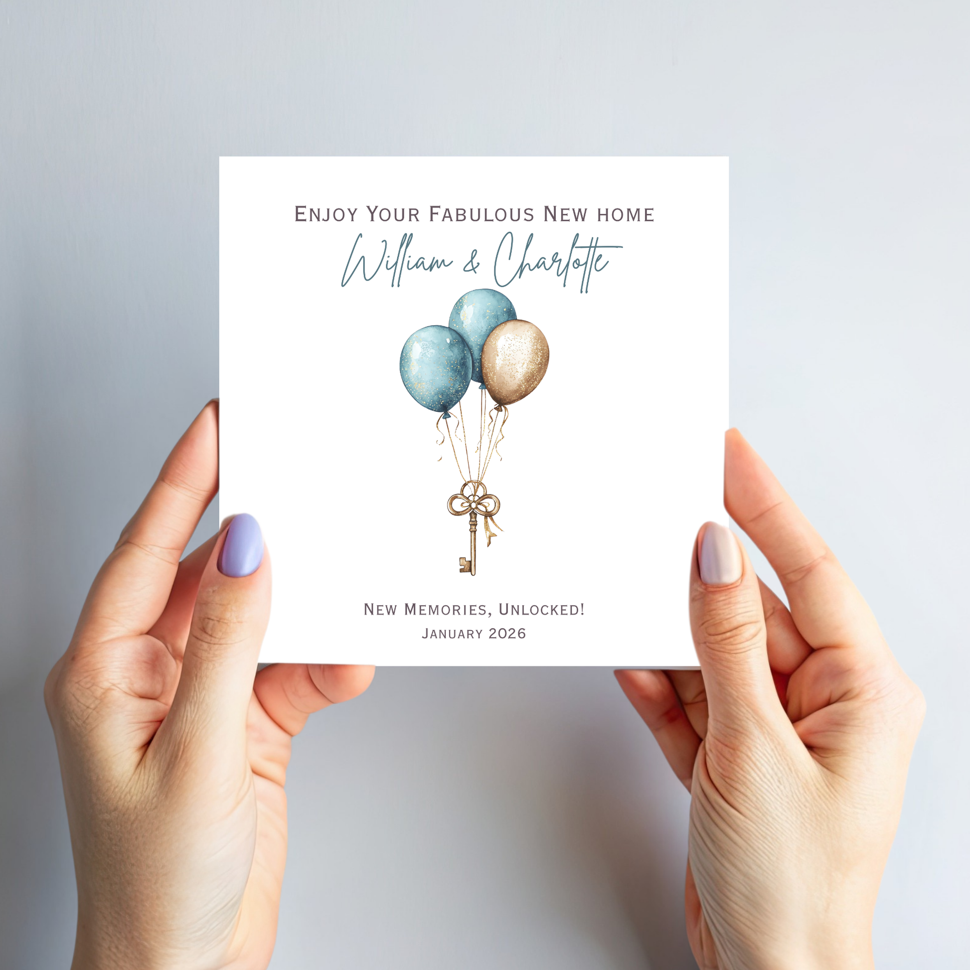 Personalised new home card with cute house key and balloon design. A thoughtful housewarming card to celebrate their move and new beginnings.