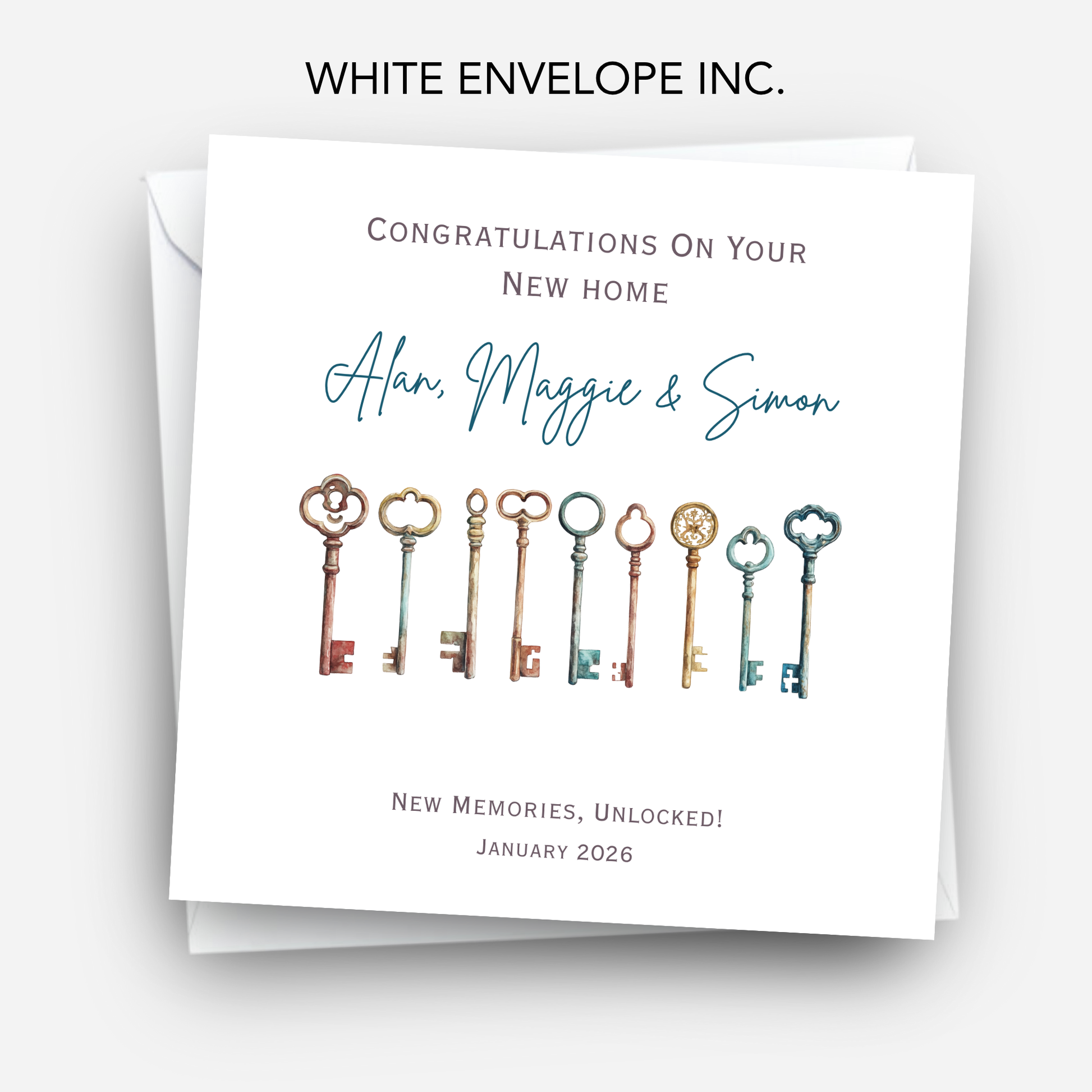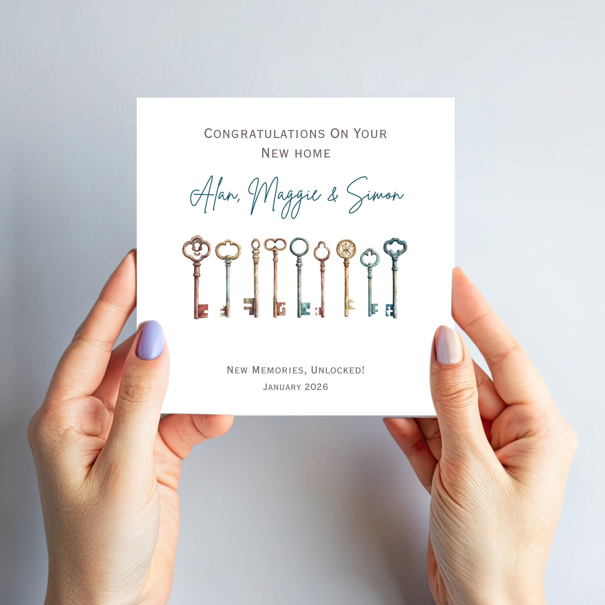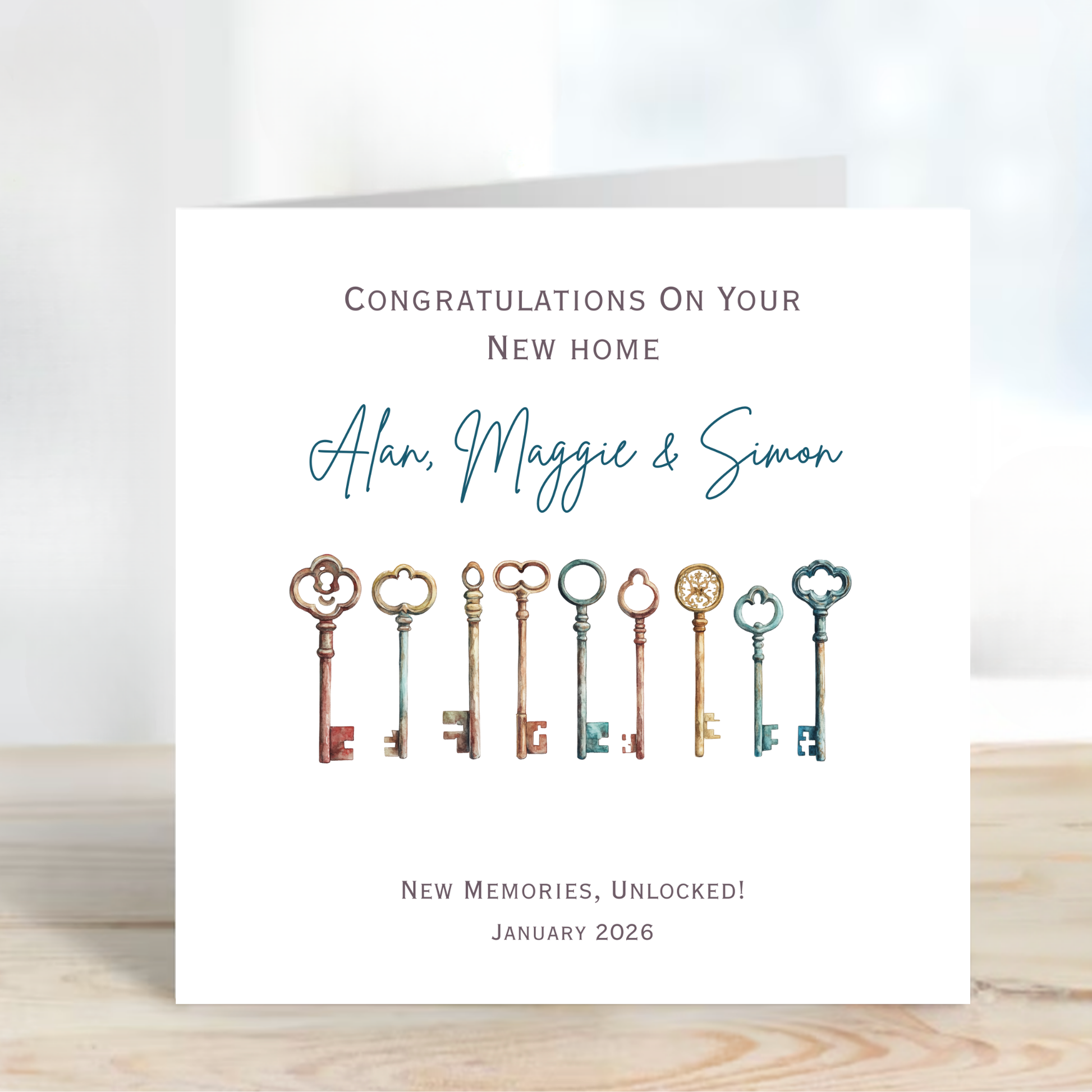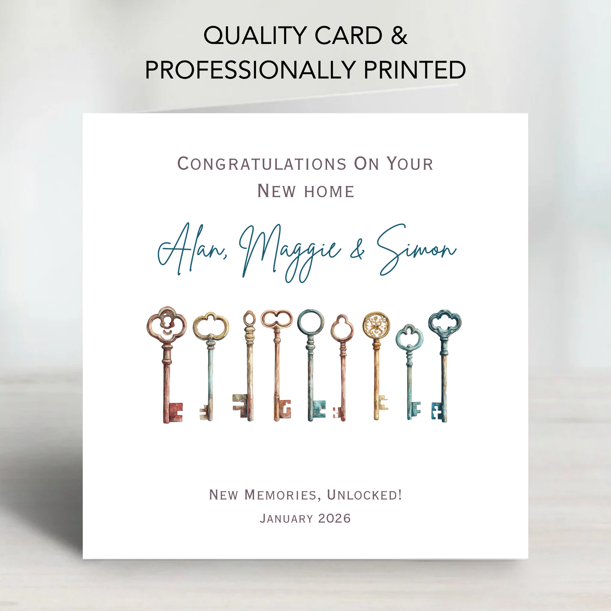 Personalised new home card with a set of vintage house keys design. A thoughtful housewarming card to celebrate their move and new beginnings.