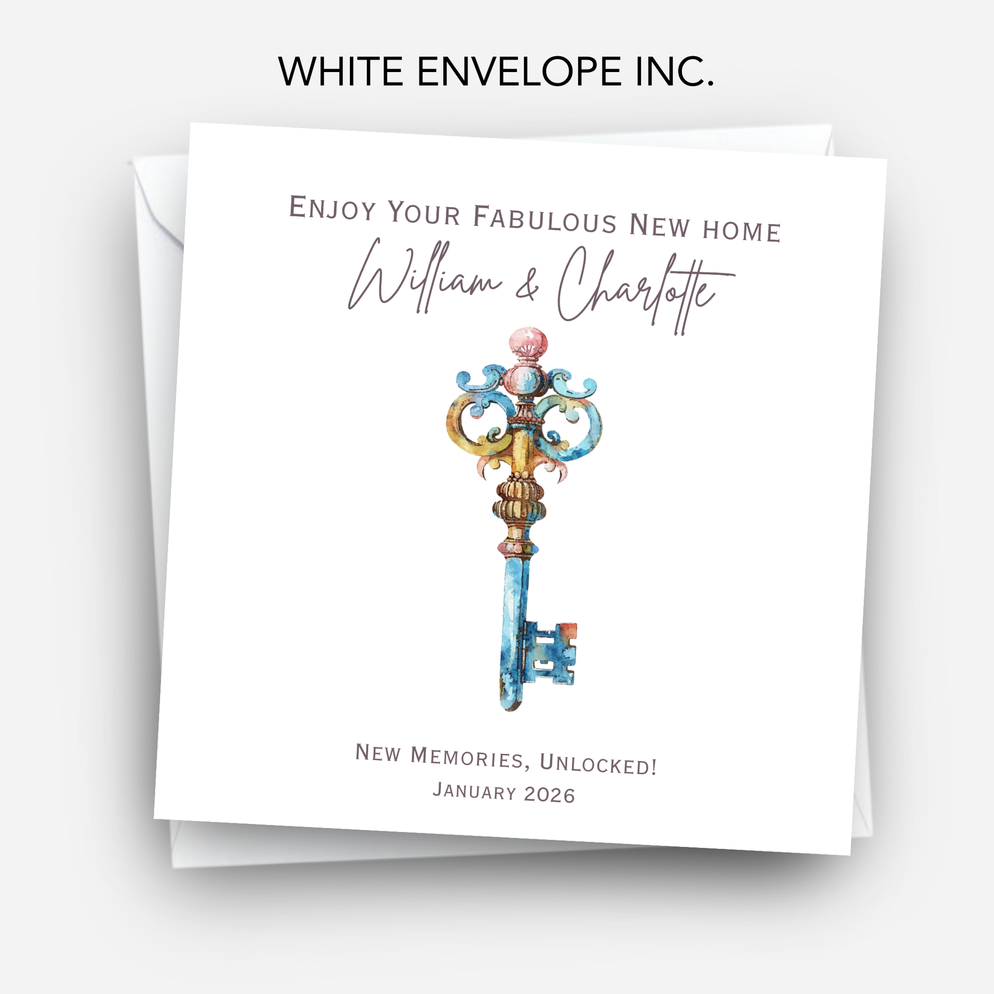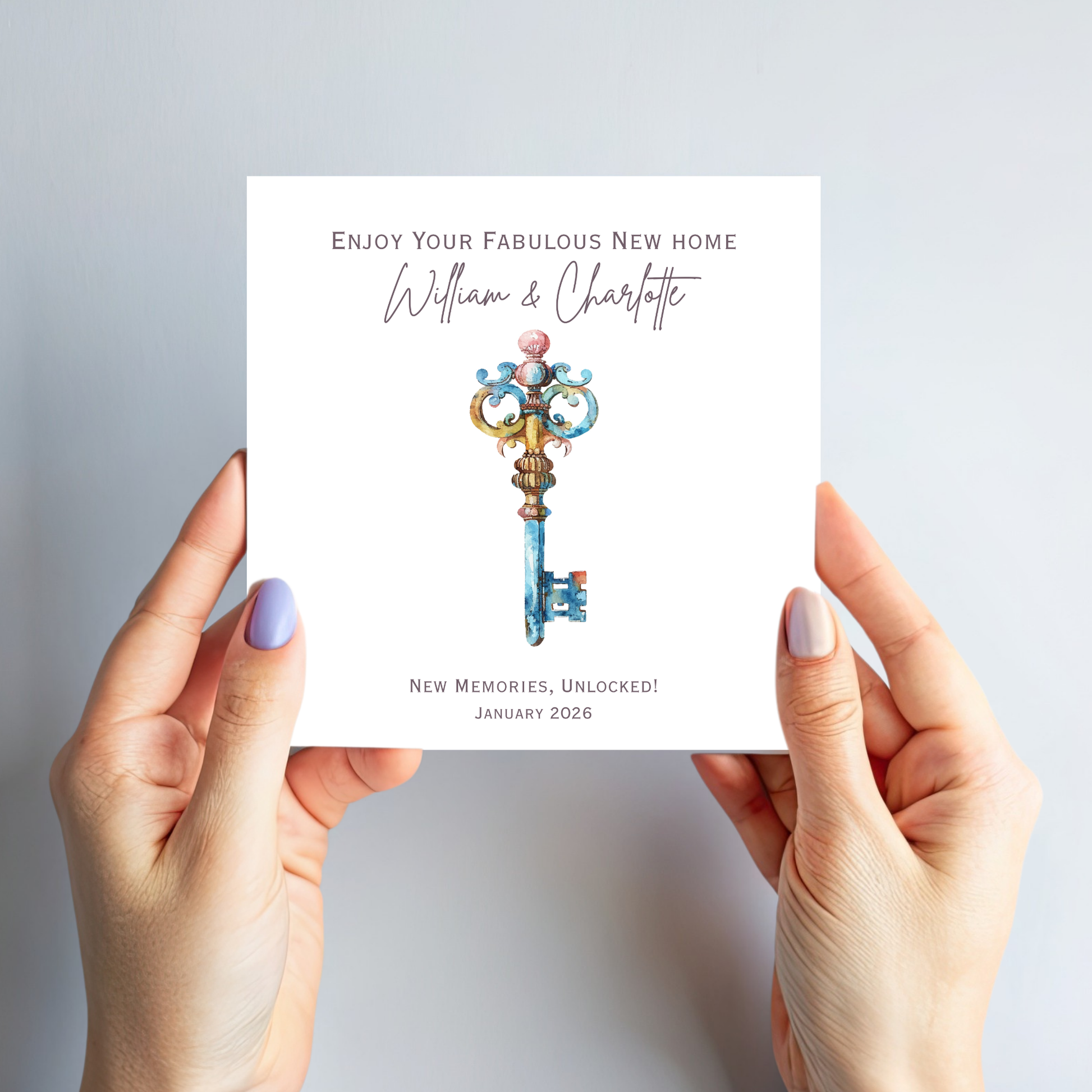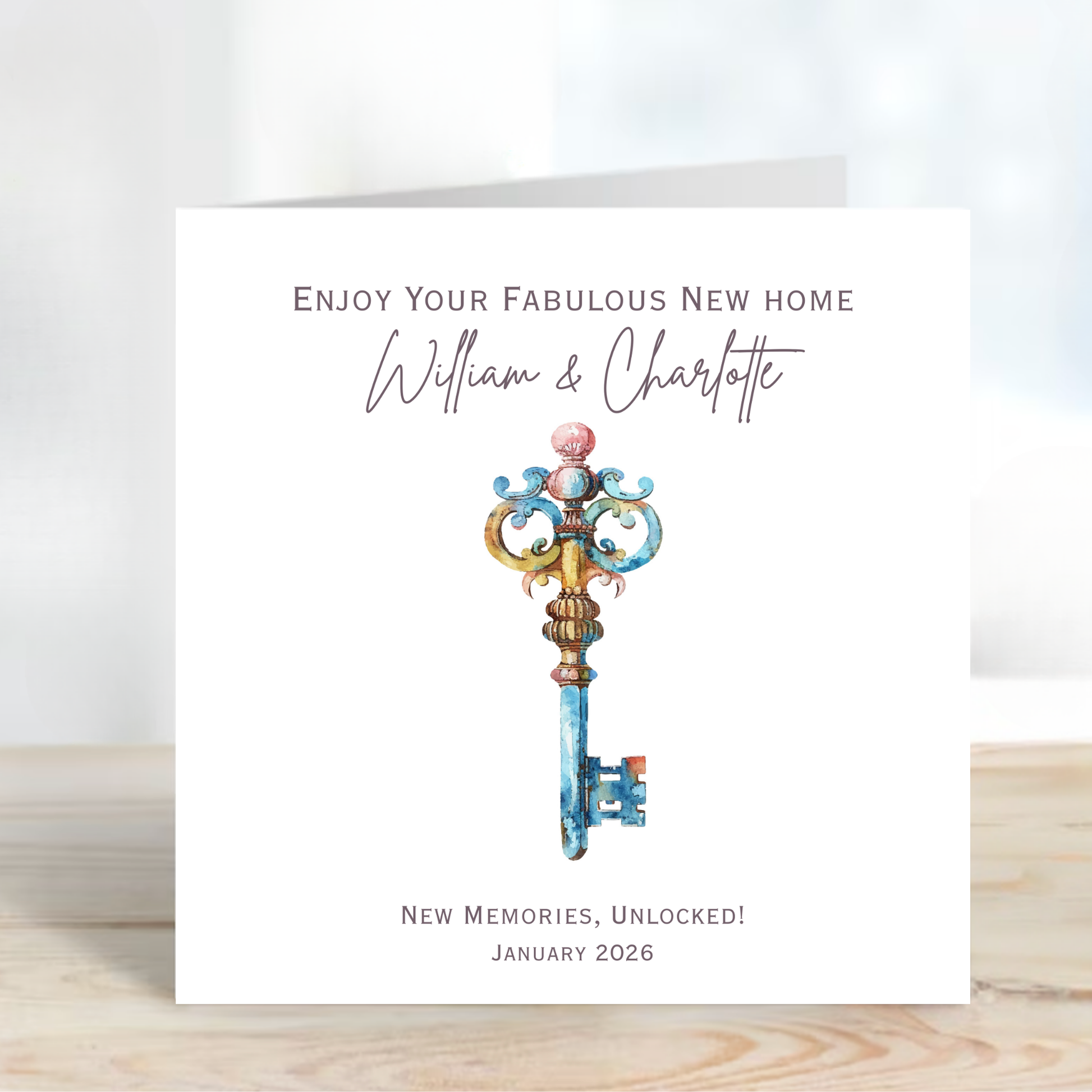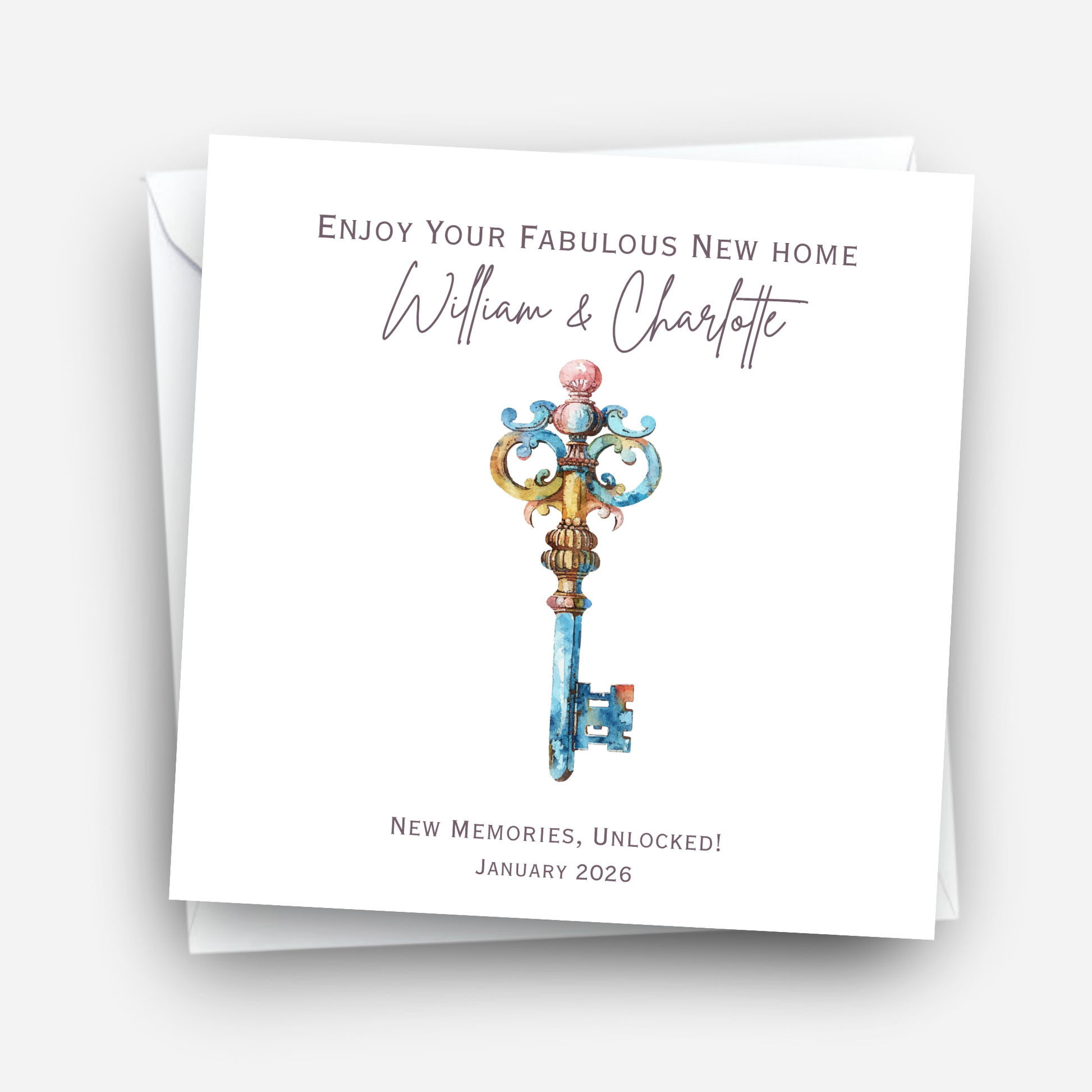 Personalised new home card with cute house key design. A thoughtful housewarming card to celebrate their move and new beginnings.