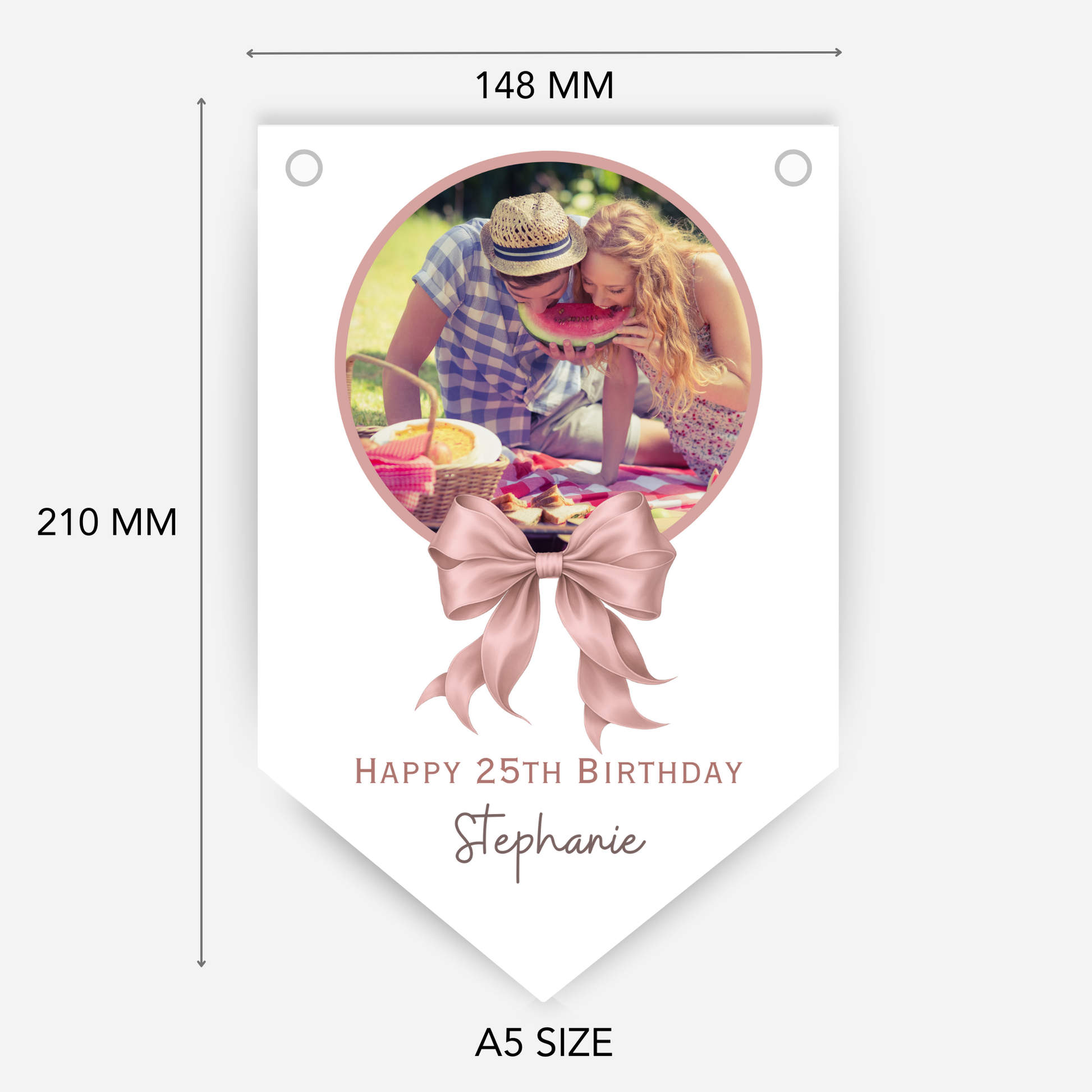 Celebrate a special birthday with our personalised photo birthday bunting, custom printed with the name, age, and up to 8 of your favourite photos! This unique party banner makes a heartwarming decoration for milestone birthdays and adds a personal touch to your party backdrop.