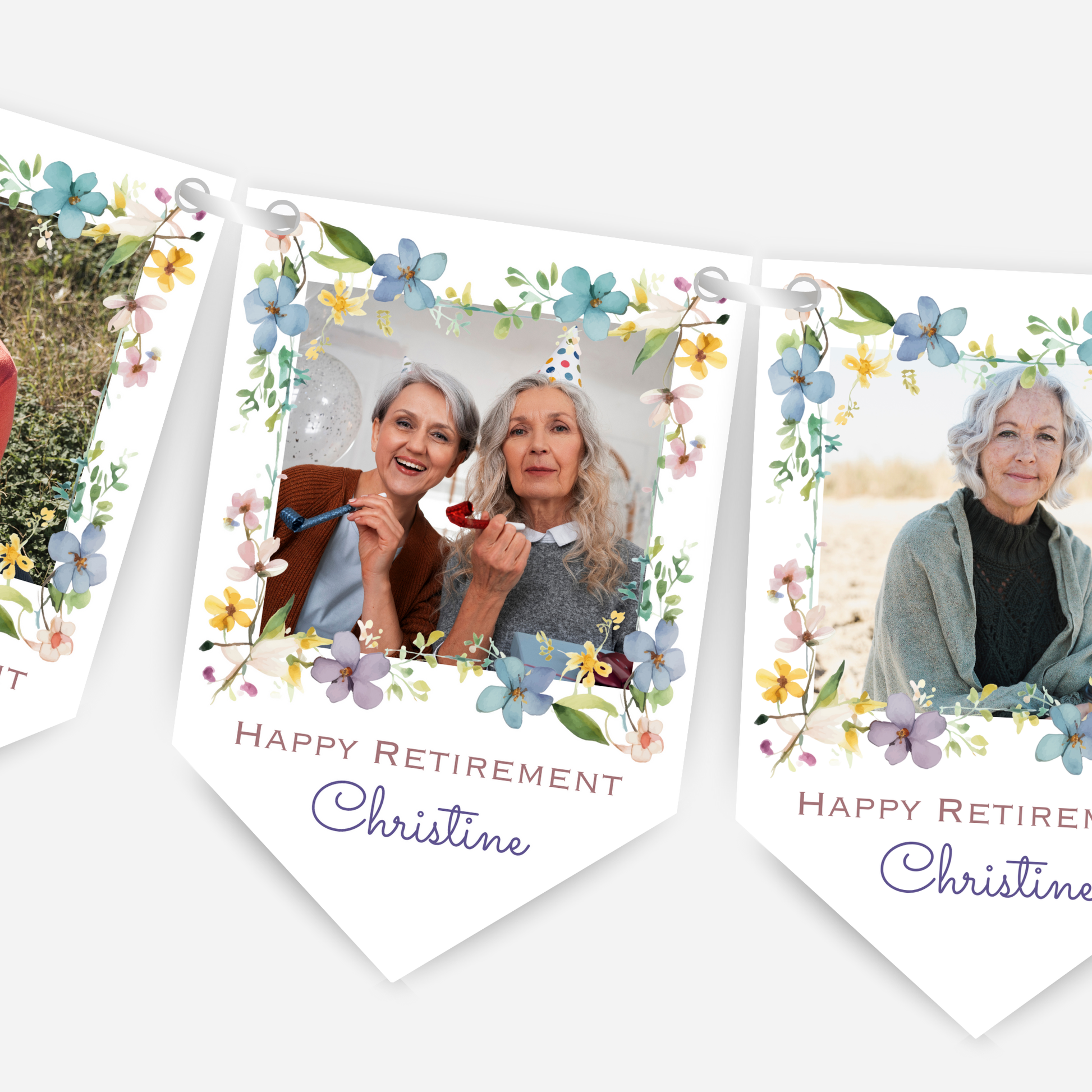 Create a heartfelt display for a retirement party with this custom photo garland, printed with eight special memories and personalised text. Each flag includes a soft floral theme, making it perfect for adding a warm, elegant touch to any celebration.