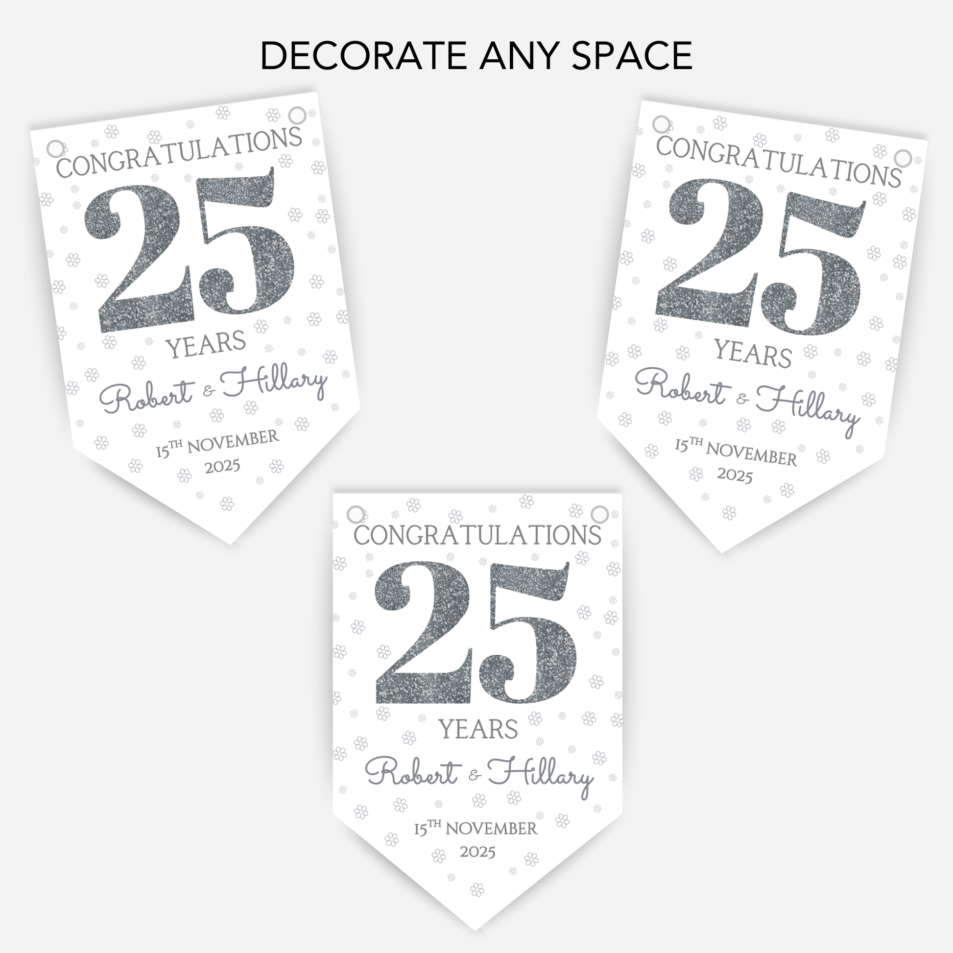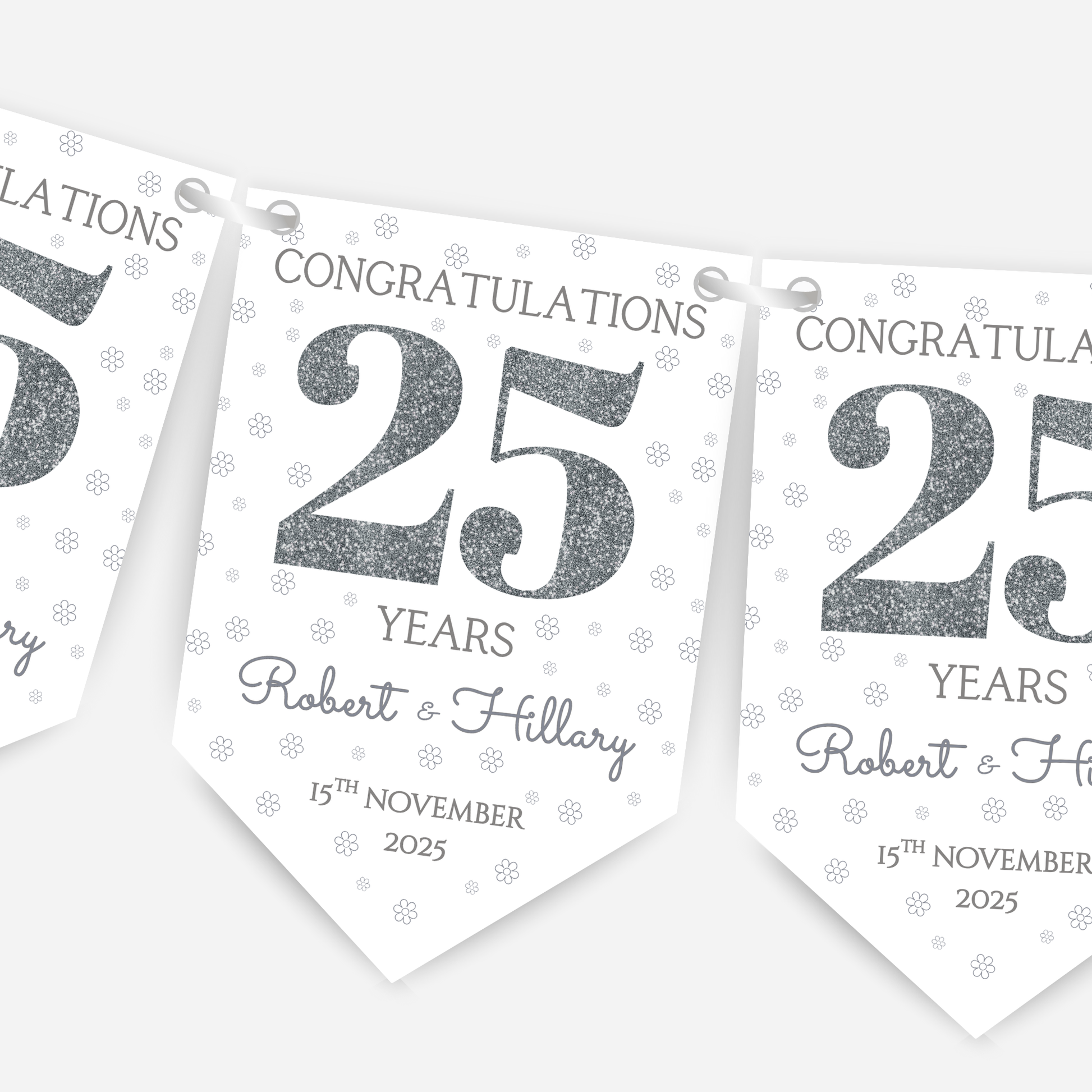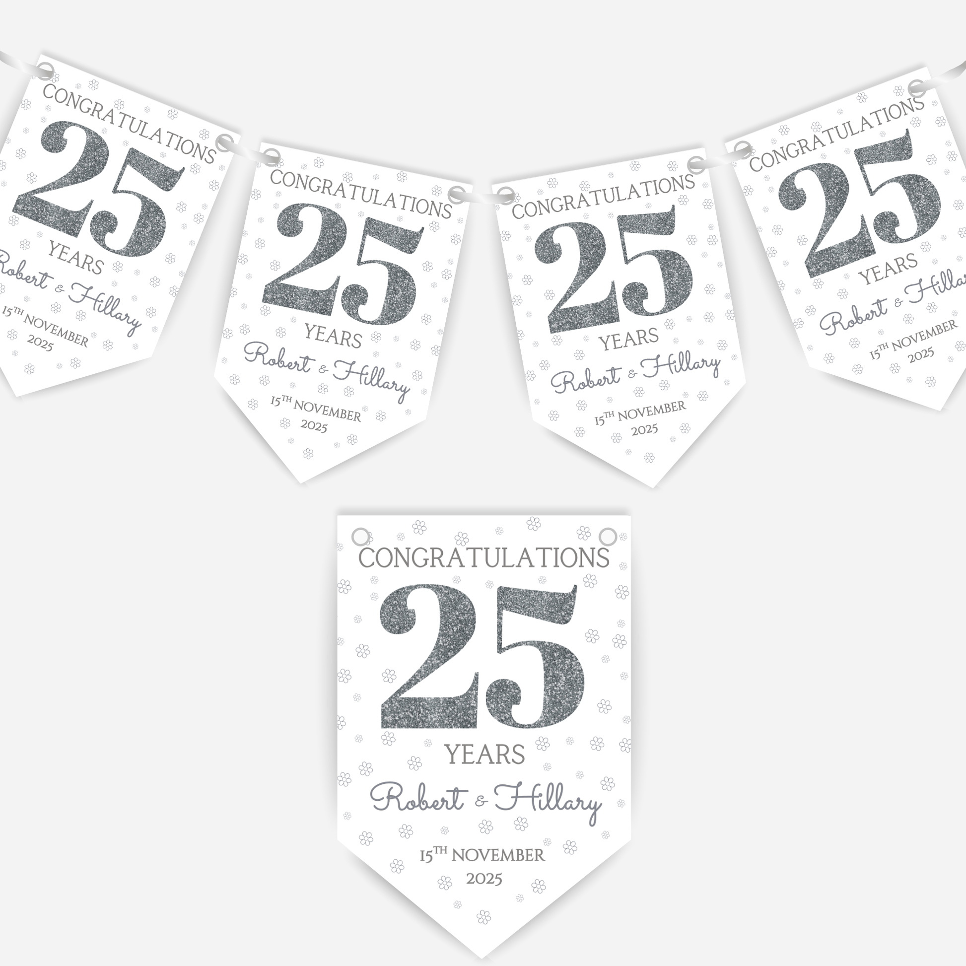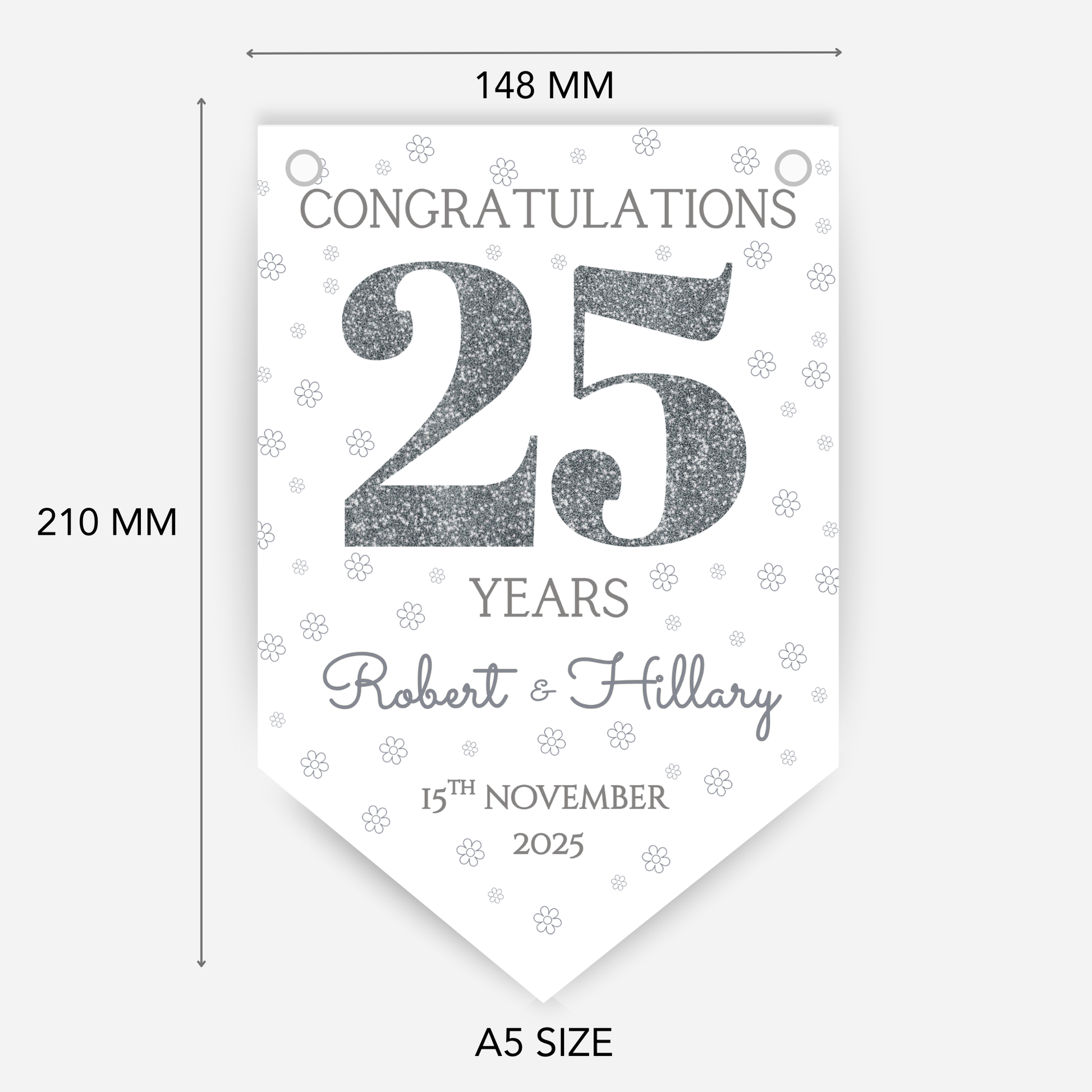 Celebrate a silver milestone with this printed and personalised Silver Wedding bunting, perfect for a 25th wedding anniversary. Featuring elegant silver colour tones and your custom names and date added to this high-quality bunting.
