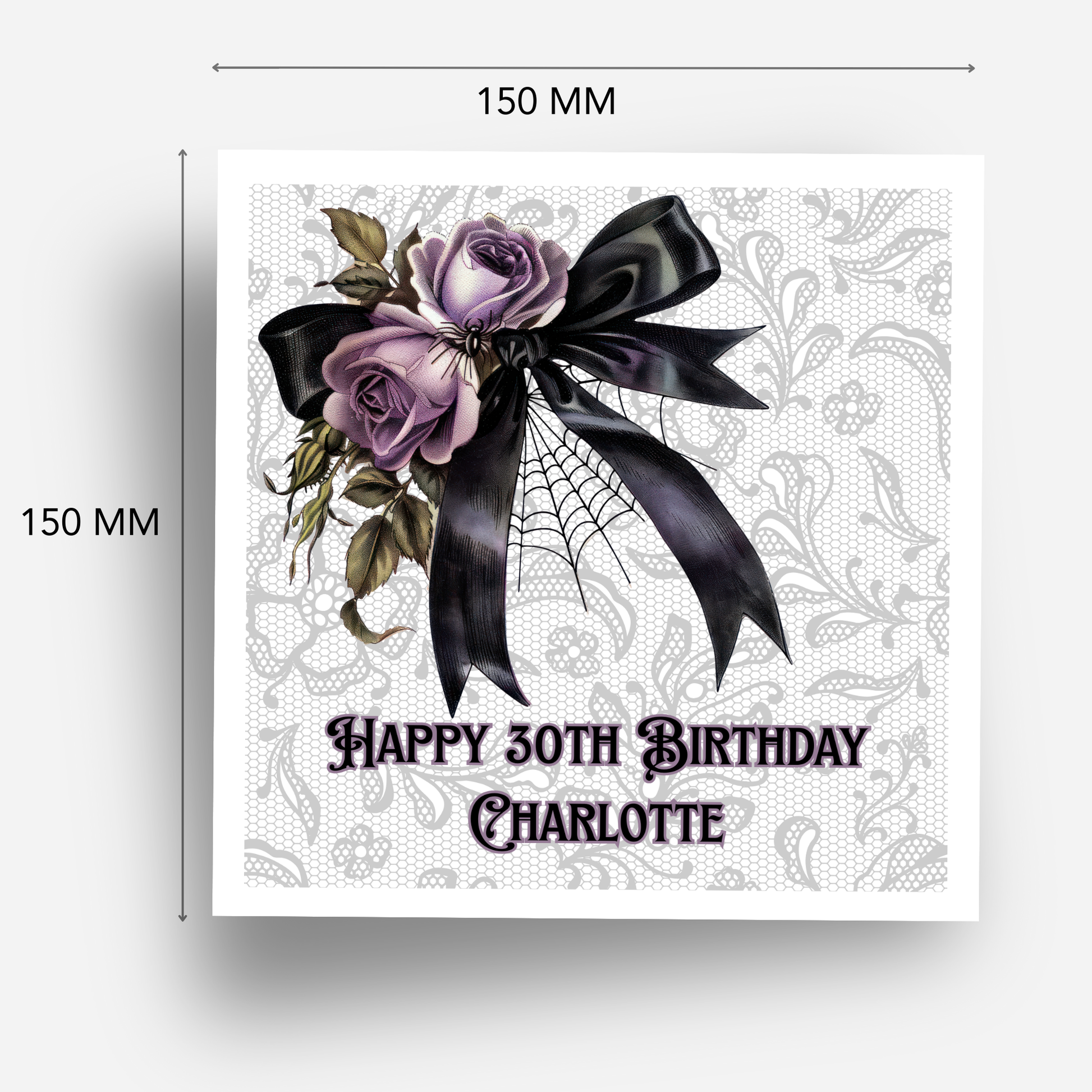 Make a bold statement with this gothic-style personalised birthday card, featuring a dramatic black bow and spider design.