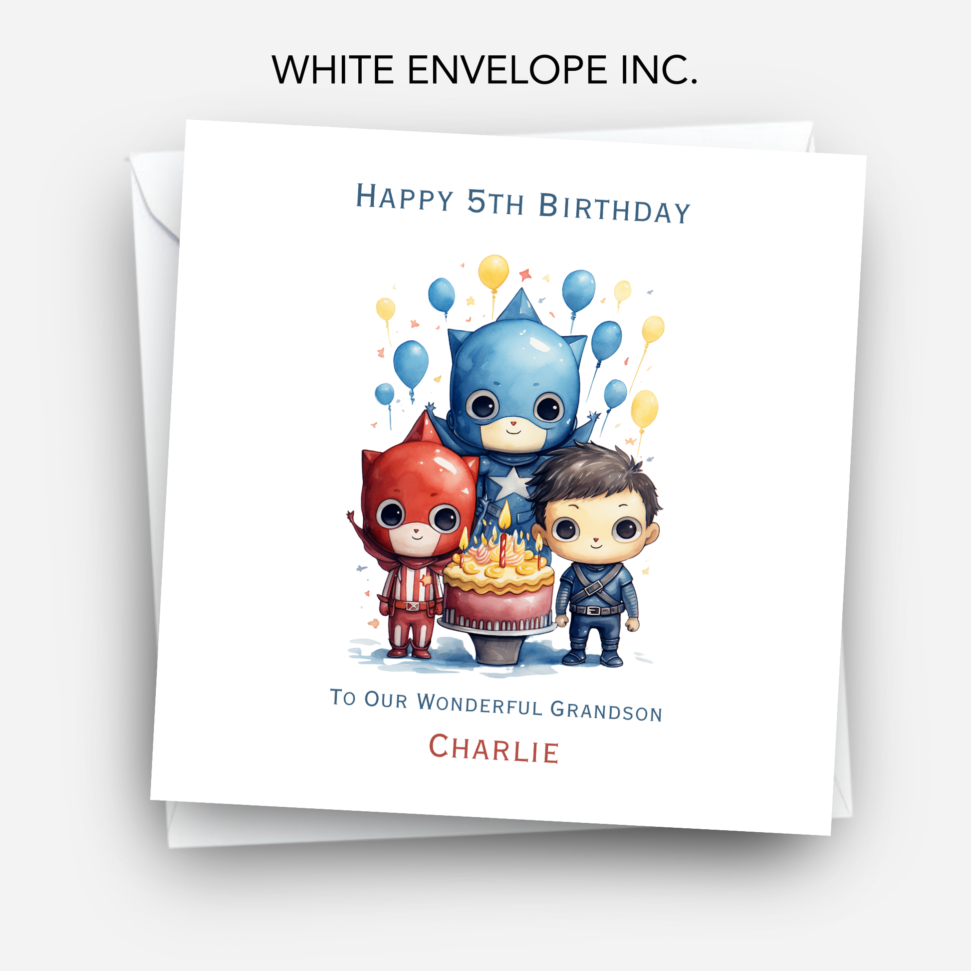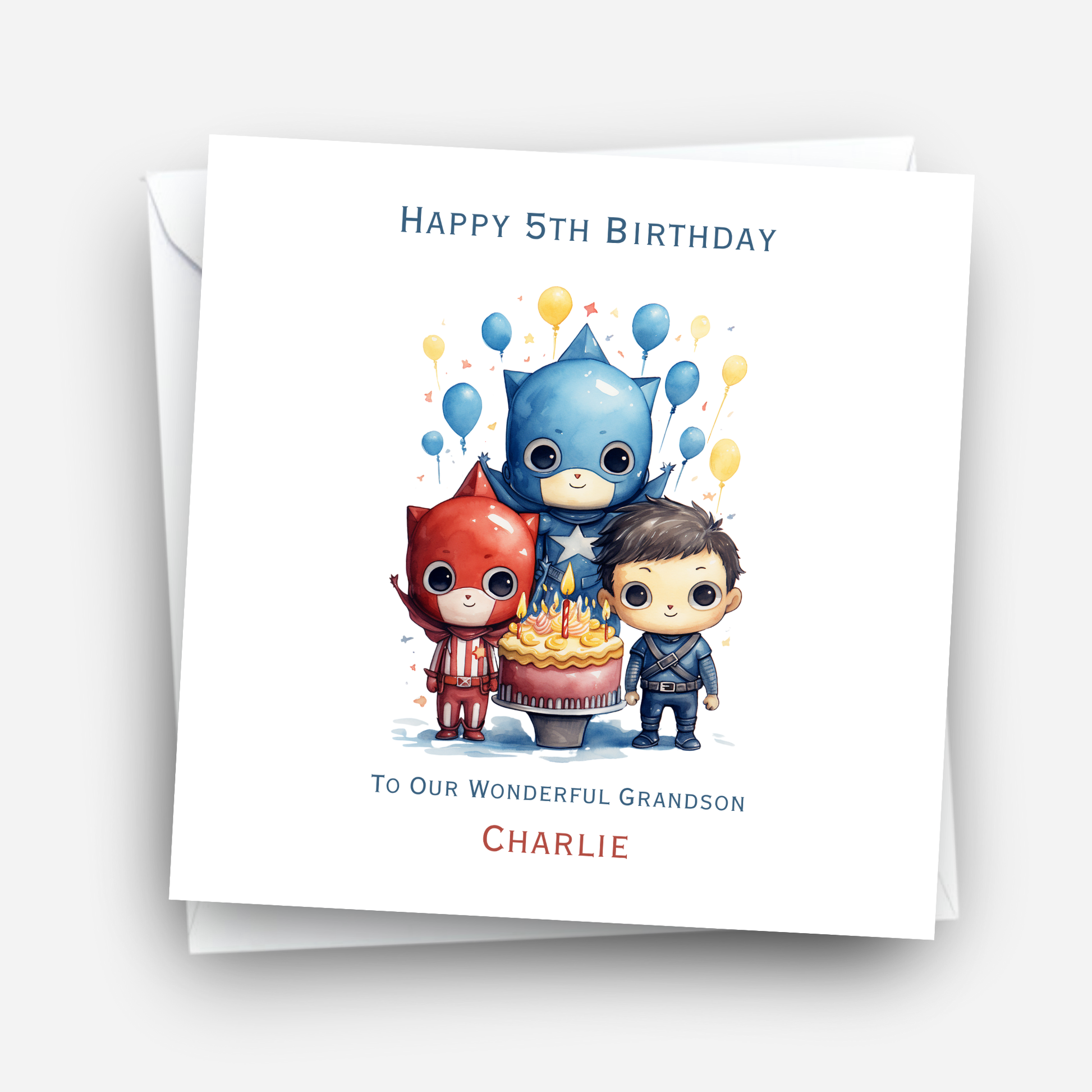 Celebrate their special day in true hero style with this personalised superhero birthday card, featuring a bold comic-style design with a birthday cake.