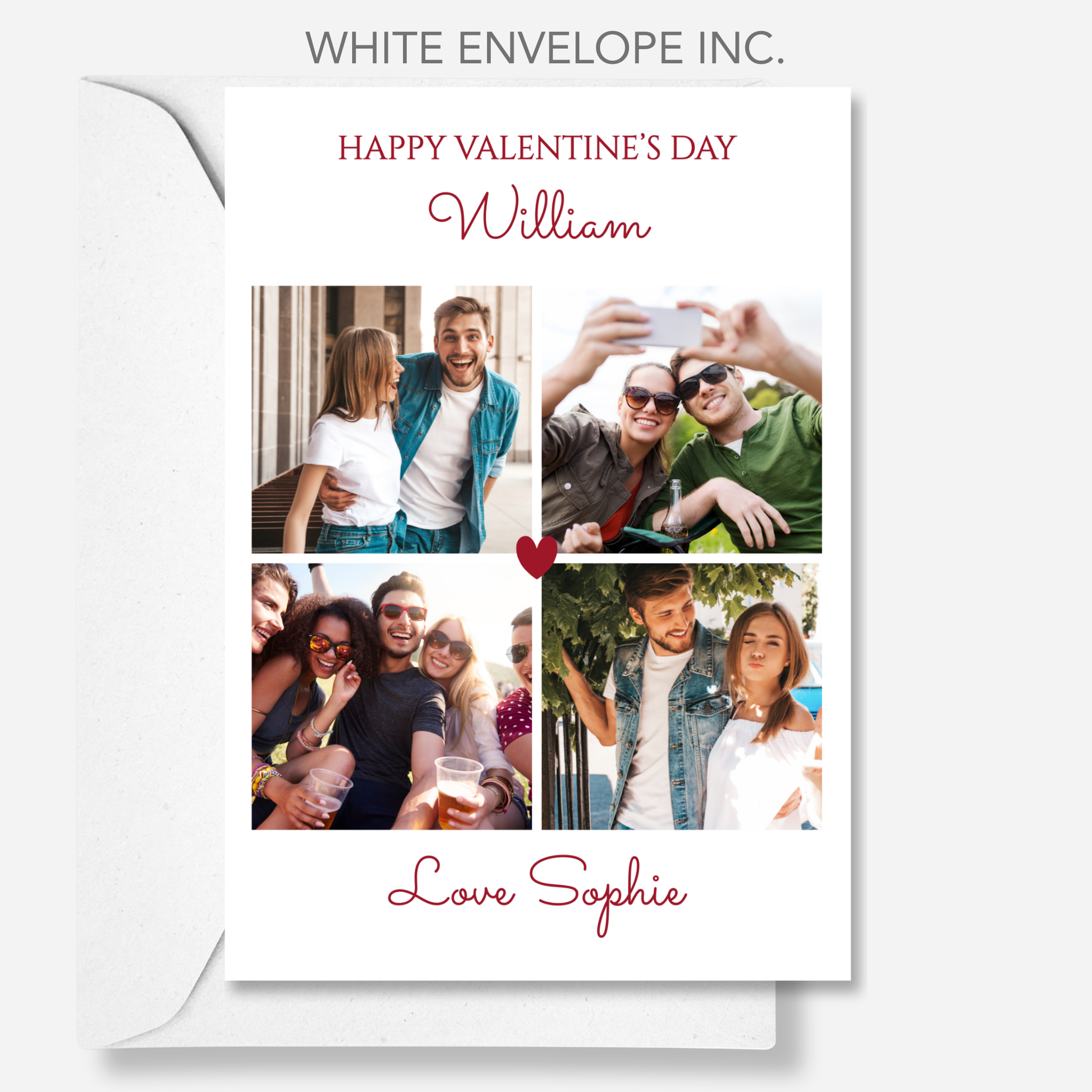 Celebrate Valentines day with a personalised collage photo card featuring 4 photos of your choice, name and any wording on the front. This custom card is a truly unique way to share memories and send your love to that special person.