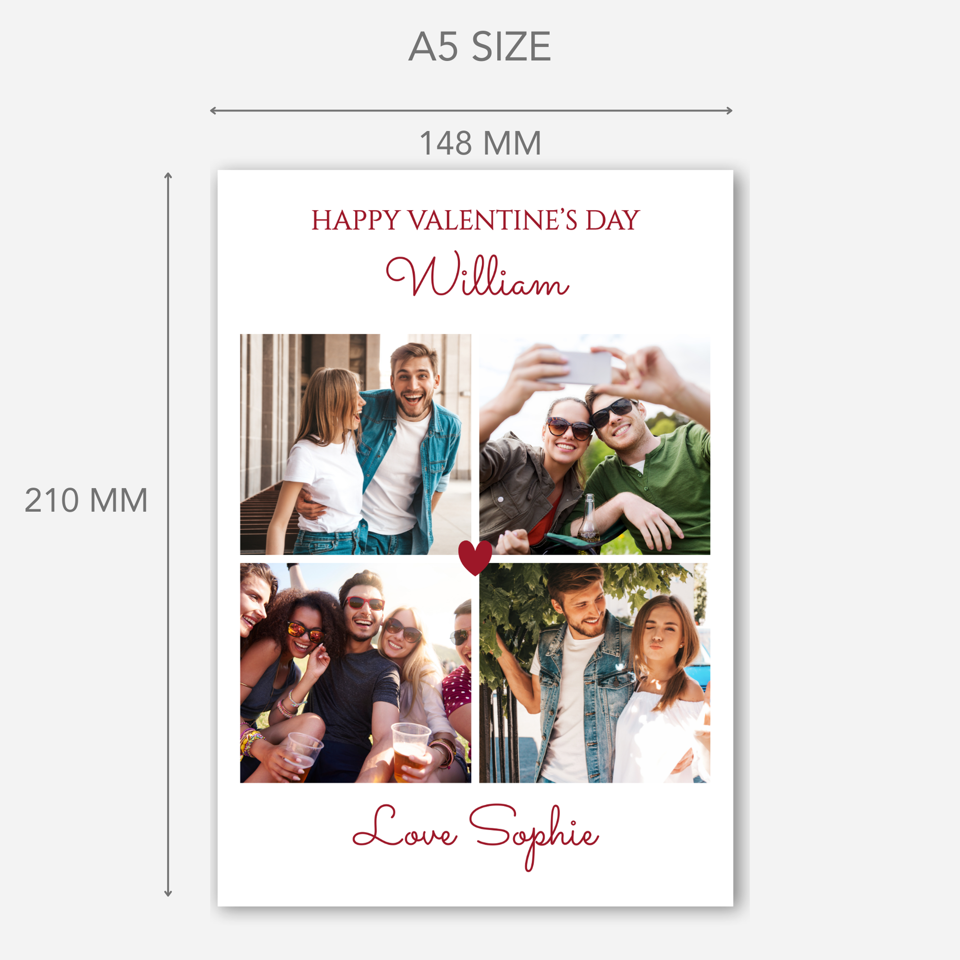Personalised photo valentine card with 4 photos, and any wording. A5 printed card with envelope, a unique keepsake for valentine's day.