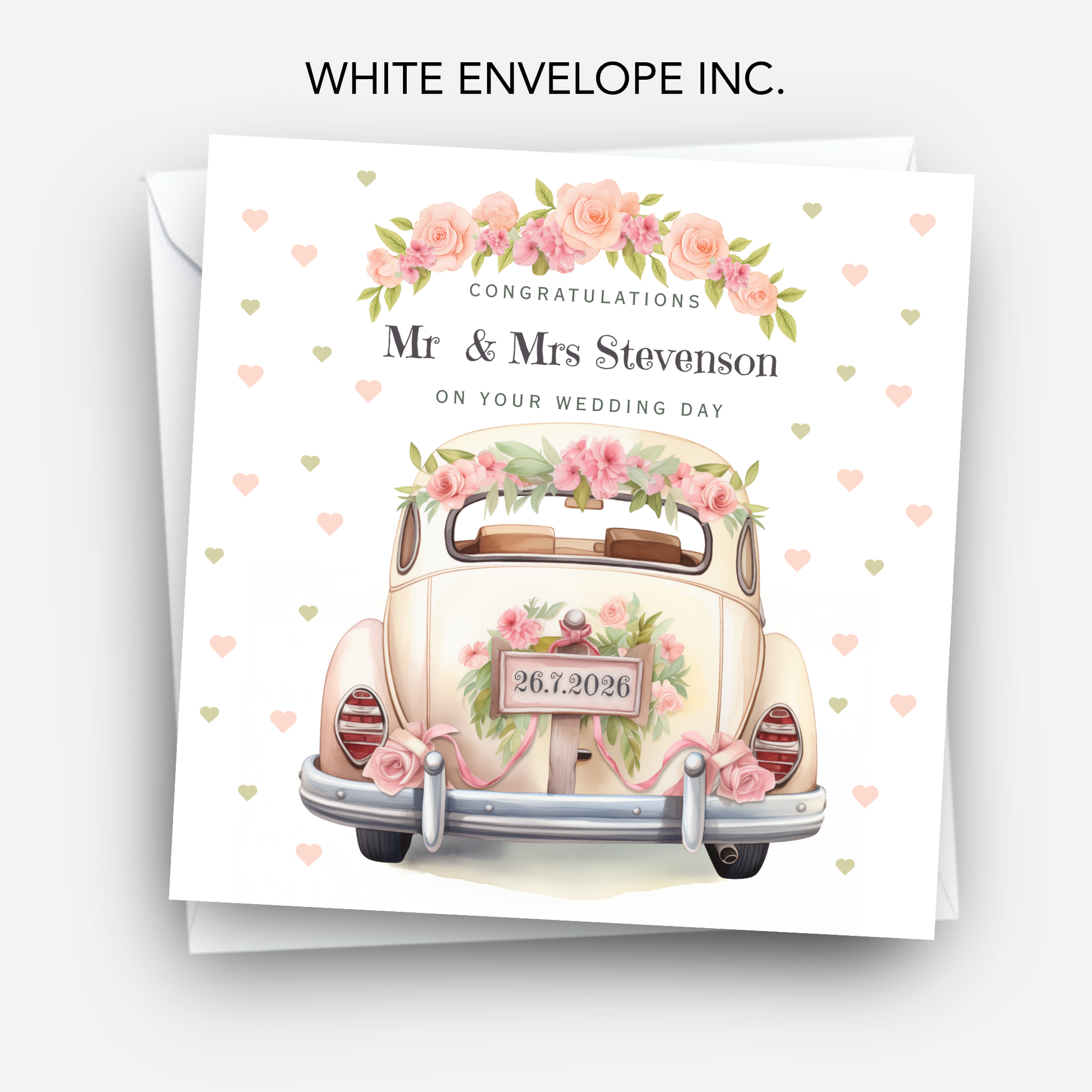 Celebrate their special day with this beautifully printed wedding card, featuring a charming wedding car and flowers design. Personalised with the couple’s names and wedding date, this card makes a memorable keepsake they’ll treasure.