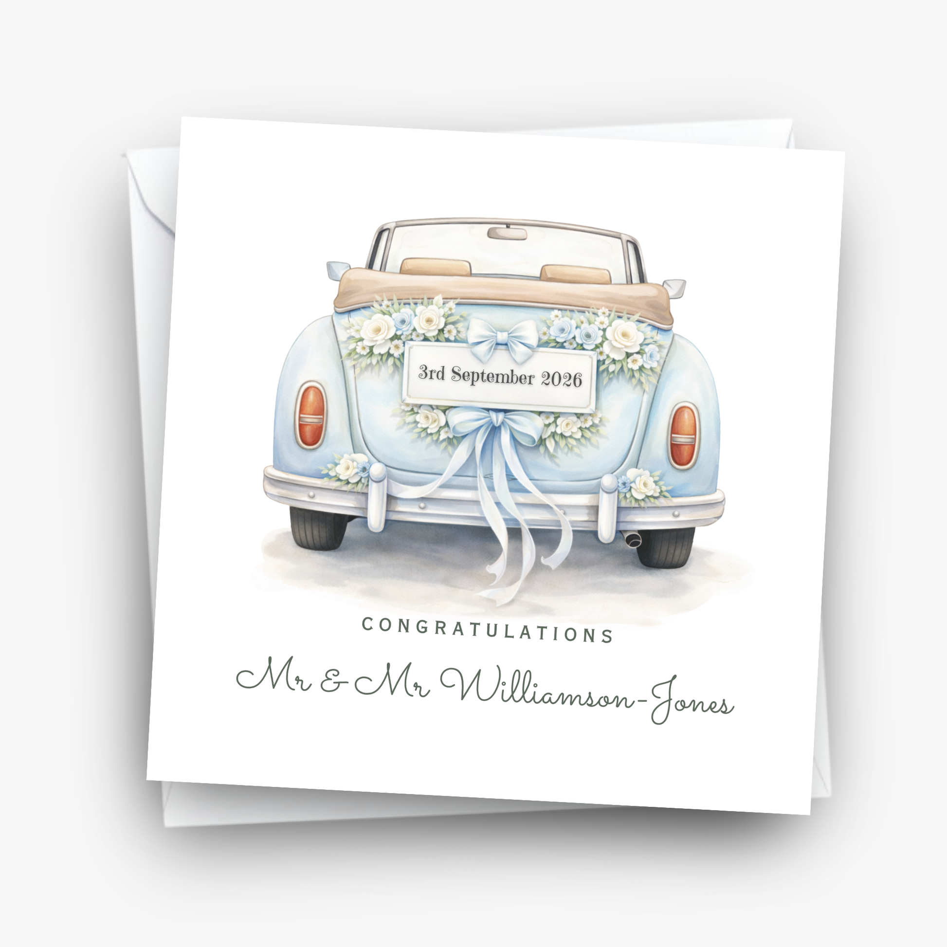 Celebrate their special day with this beautifully printed wedding card, featuring a charming wedding car and flower design. Personalised with the couple’s names and wedding date, this card makes a memorable keepsake they’ll treasure.